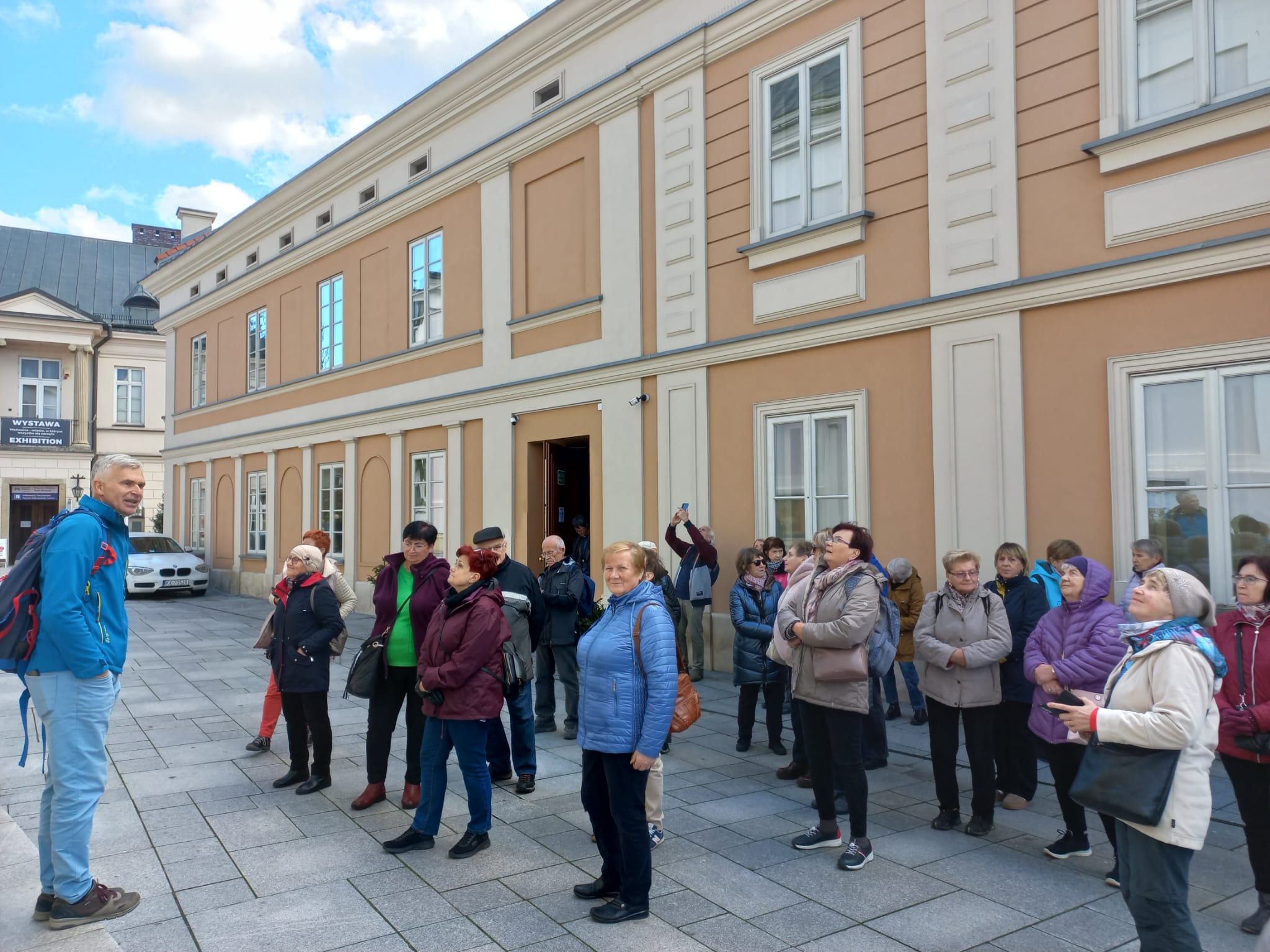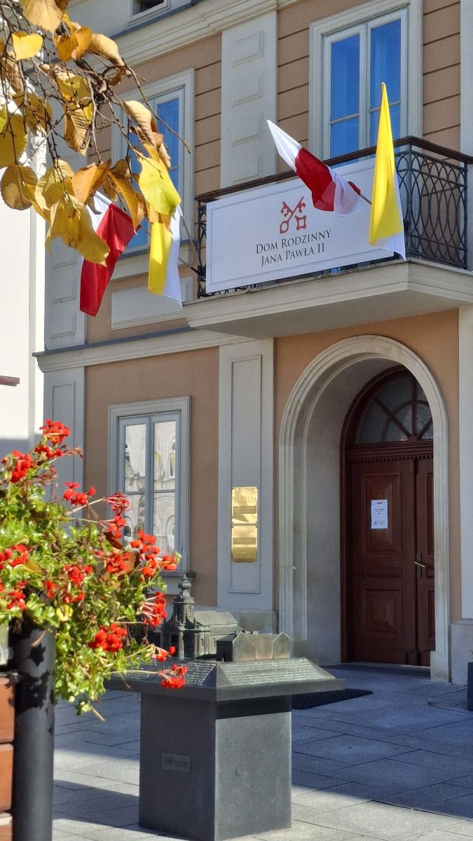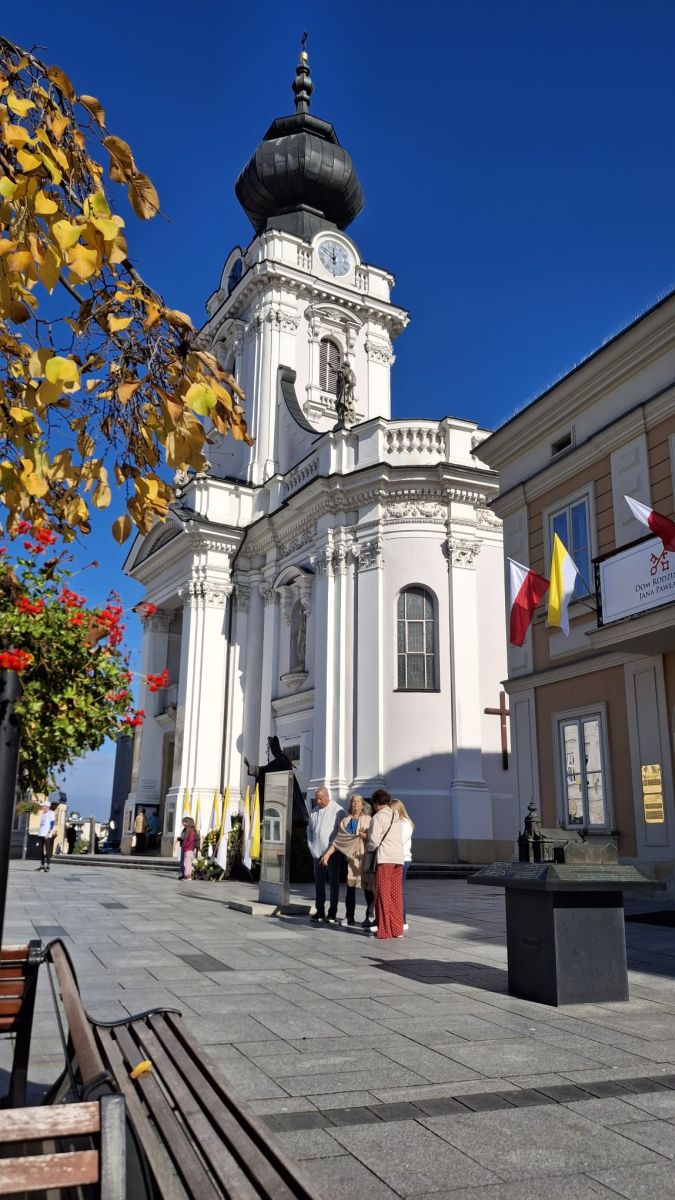 Następnie przeszliśmy spacerem przez rynek, do Domu Rodzinnego J.P. II w którym od 1984 r mieści się Muzeum. Jest to pierwsza na świecie, multimedialna narracyjna wystawa będąca opowieścią o Karolu Wojtyle. Mieści się w kamienicy z 1870 r. w której od 1919 r. zamieszkali rodzice Karola Wojtyły a rok później urodził się on sam. Obecną formę ekspozycji, muzeum uzyskało dopiero w 2014 r. Kolejne etapy życia Karola Wojtyły przedstawiono w 16-tu (zlokalizowanych na 4-rech kondygnacjach) strefach wystawowych. Muzeum warte odwiedzenia; ciekawe dokumenty archiwalne i atrakcyjna forma przekazu. Dodatkową atrakcją (w tym dniu przypadała 47 rocznica pontyfikatu J.P.II) były historyczne stroje które miały na sobie „osoby opowiadające”. Parę metrów od Muzeum, znajduje się Bazylika Ofiarowania NMP. Jest to kościół parafialny noszący tytuł Bazyliki Mniejszej, nadany przez J.P. II w 1992 r. Murowany kościół w stylu późnobarokowym wybudowano w latach 1792- 1798. Współczesnym elementem wystroju wnętrza bazyliki jest polichromia sklepień (2000-2003 r) nawiązująca do nauczania J.P.II. Na uwagę zasługuje widniejący na ścianie bazyliki a widziany z dawnego mieszkania Wojtyłów, zegar słoneczny z sentencją „czas ucieka, wieczność czeka” przypisywaną J.P.II.