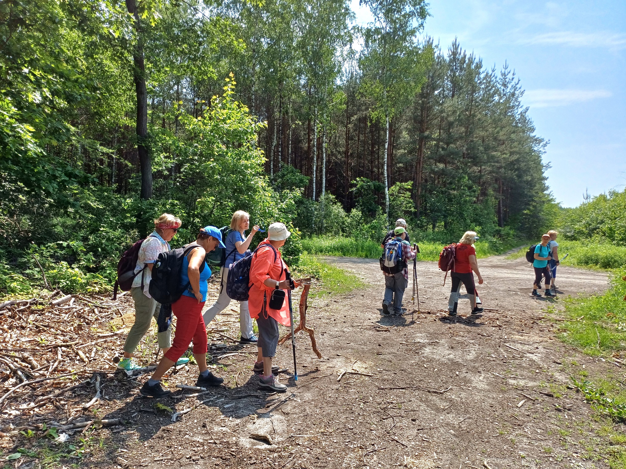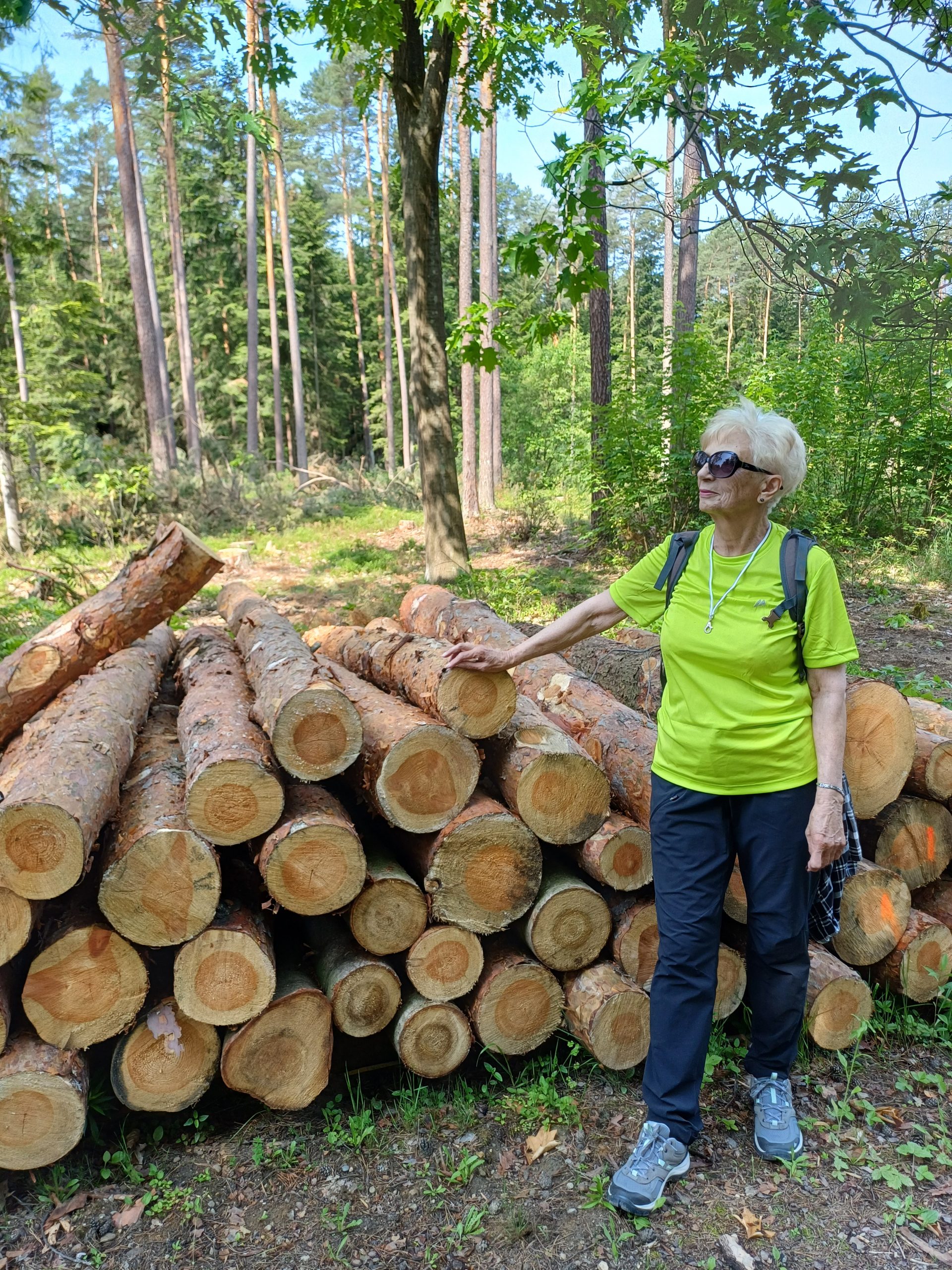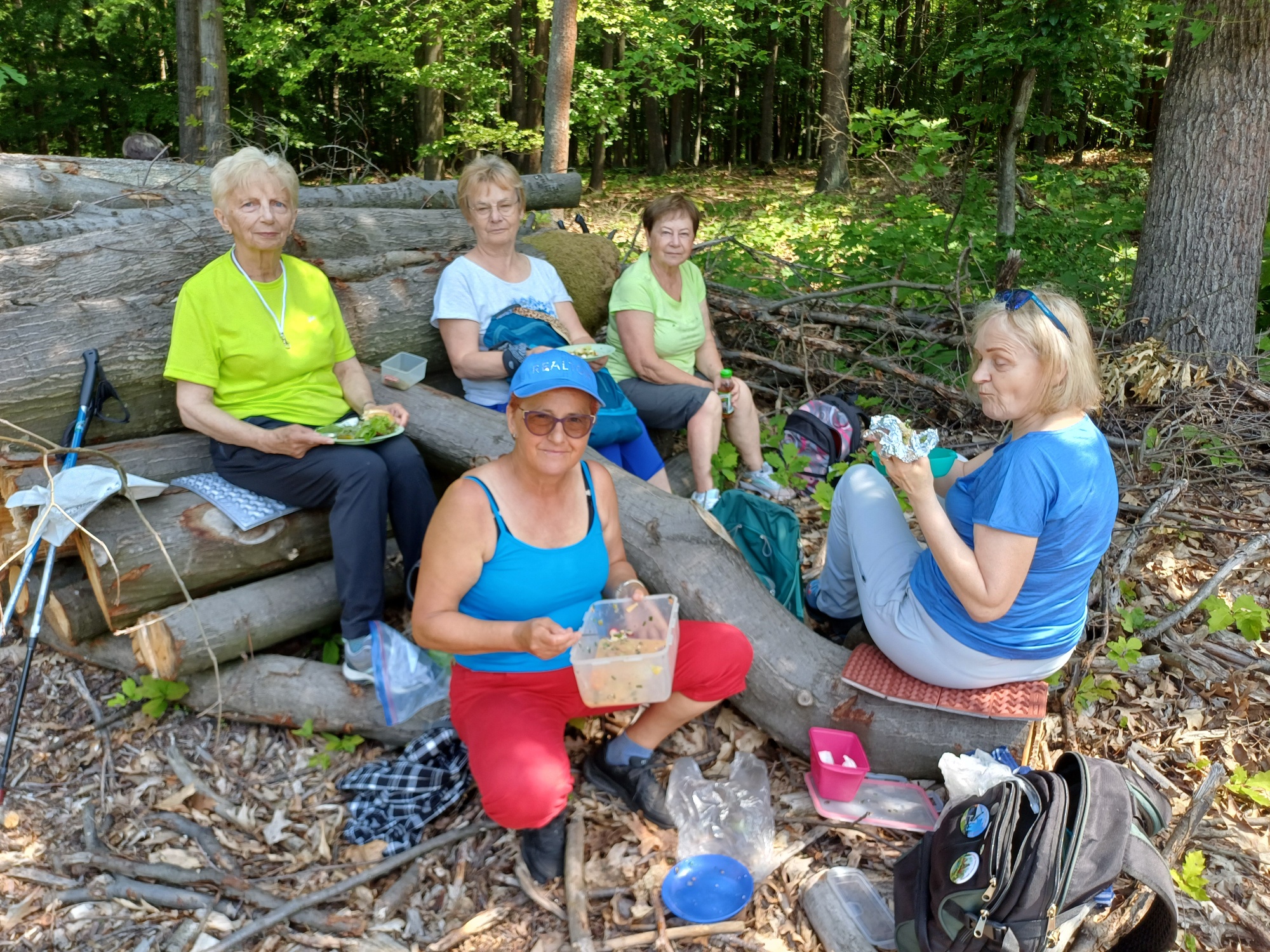 Kolejna krótka i łatwa wycieczka, w sam raz na ciepłą, słoneczną pogodę. Z Czarnej wybraliśmy się na leśną i prostą drogę, otoczoną wysokimi drzewami, dającymi cień i ochłodę, przy lekkim wietrze. Na poboczu dużo poustawianych ściętych drzew, tzw. metrówek, a jedno ścięte drzewo przykuło naszą uwagę. Średnica pnia wynosiła ponad 1 metr, u pnia jak i korony drzewo było zdrowe, natomiast jego środek miał spróchniałą dziurę. I właśnie takie kłody drzew posłużyły nam za ławki do siedzenia i na odpoczynek. Szum drzew i śpiewy ptaków pozwoliły nam na pełny relaks na łonie natury. 11 osób i 11 kilometrów to dzisiejszy wynik, a wycieczkę zakończyliśmy w Jodłówce Wałki.