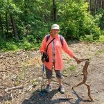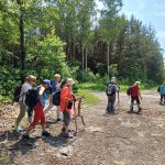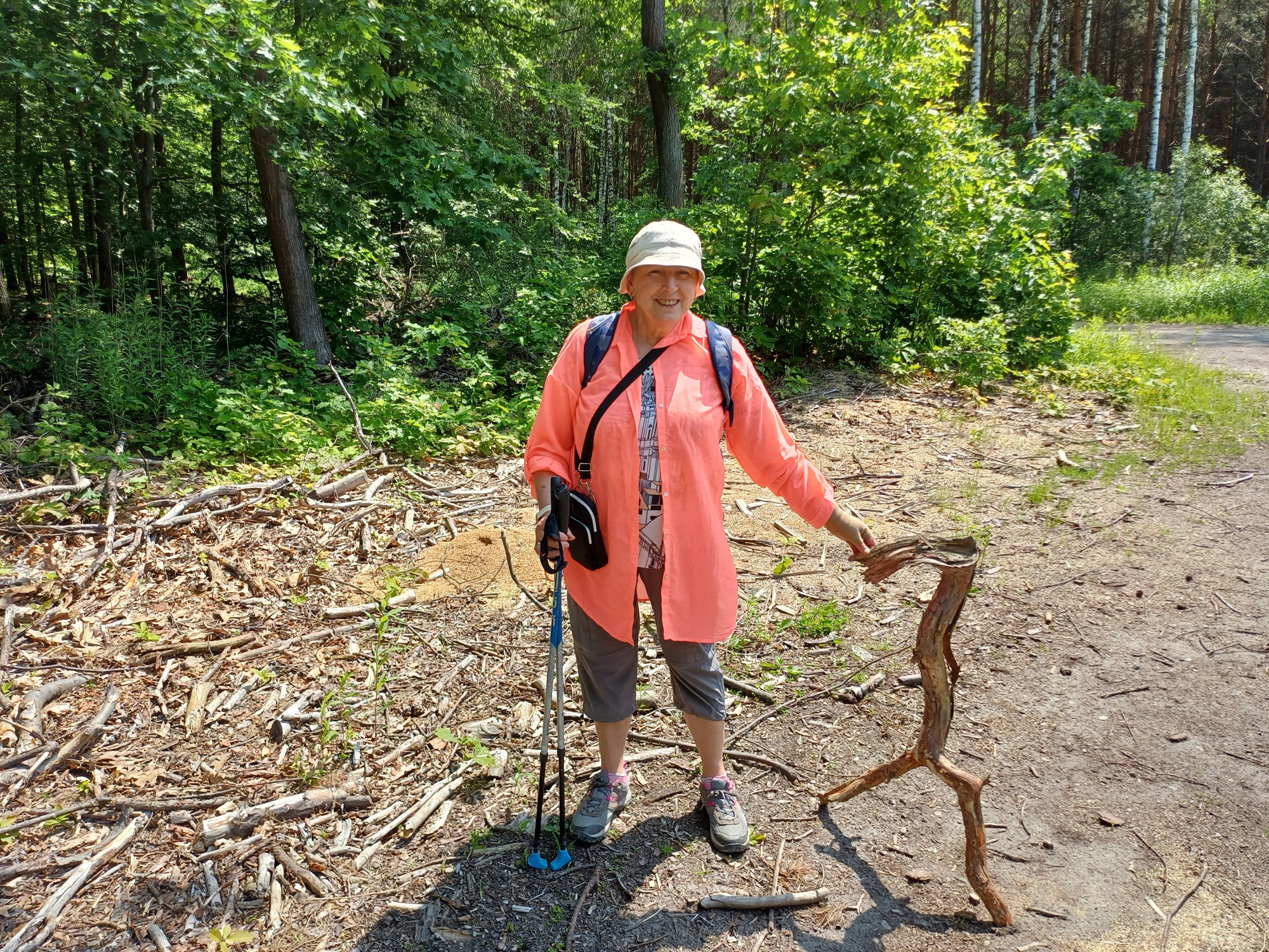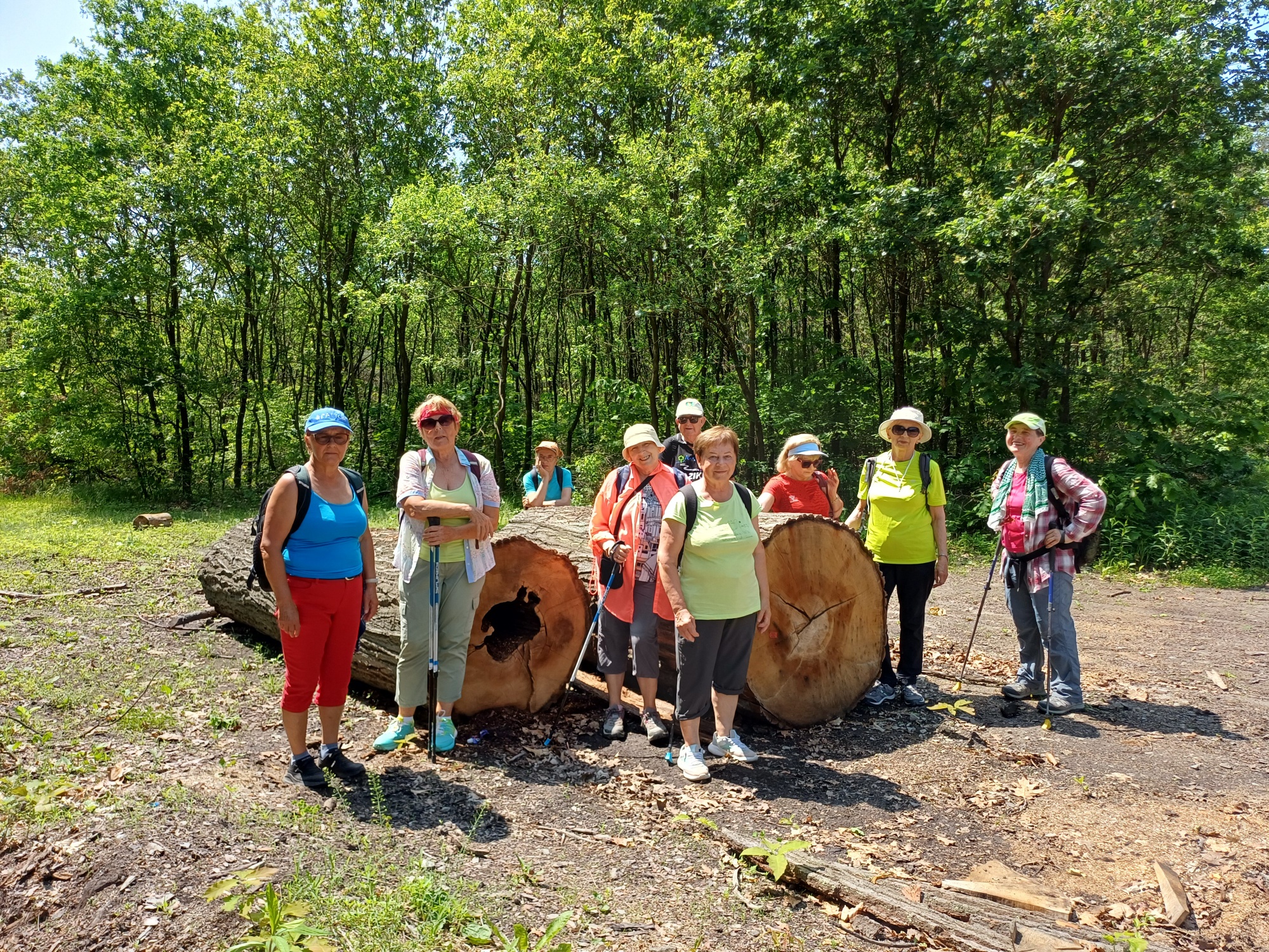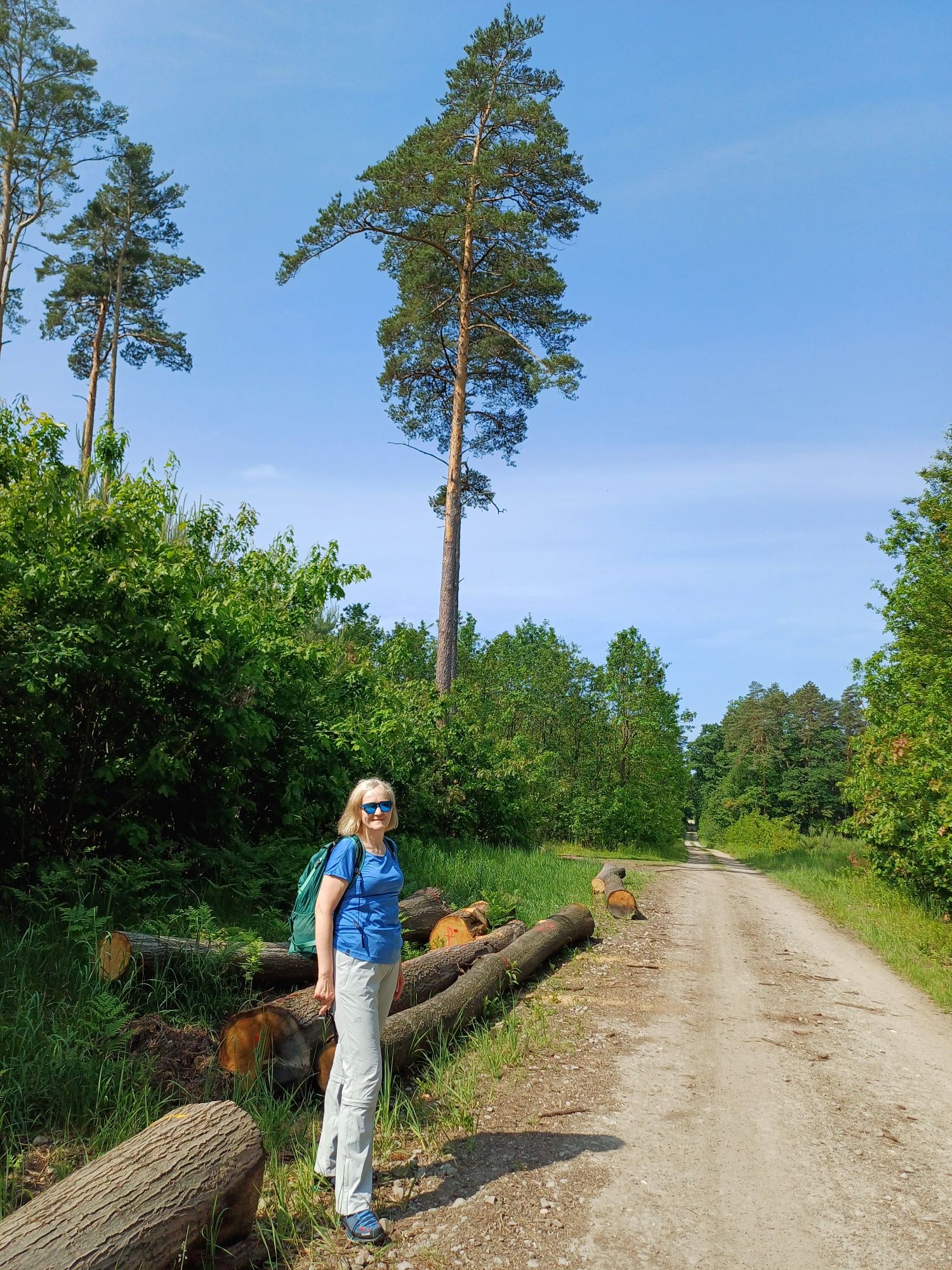 Kolejna krótka i łatwa wycieczka, w sam raz na ciepłą, słoneczną pogodę. Z Czarnej wybraliśmy się na leśną i prostą drogę, otoczoną wysokimi drzewami, dającymi cień i ochłodę, przy lekkim wietrze. Na poboczu dużo poustawianych ściętych drzew, tzw. metrówek, a jedno ścięte drzewo przykuło naszą uwagę. Średnica pnia wynosiła ponad 1 metr, u pnia jak i korony drzewo było zdrowe, natomiast jego środek miał spróchniałą dziurę. I właśnie takie kłody drzew posłużyły nam za ławki do siedzenia i na odpoczynek. Szum drzew i śpiewy ptaków pozwoliły nam na pełny relaks na łonie natury. 11 osób i 11 kilometrów to dzisiejszy wynik, a wycieczkę zakończyliśmy w Jodłówce Wałki.