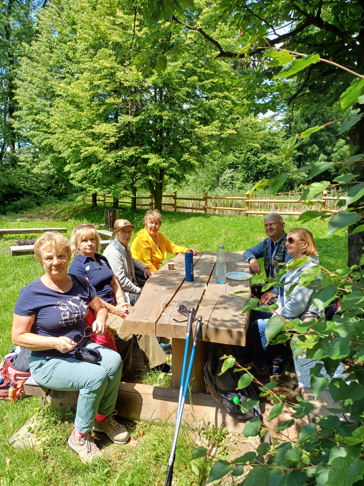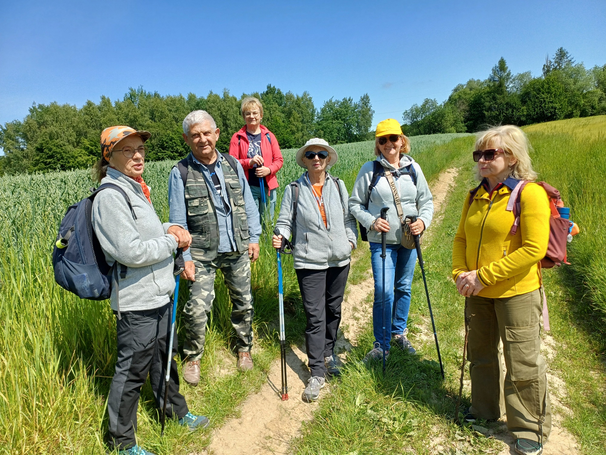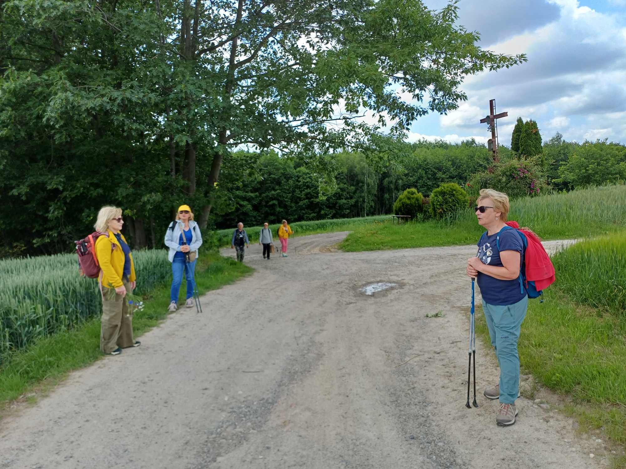 Pogoda jak zwykle dopisała, za to grupa przyszła w okrojonym składzie, 7 osób, czyżby zaczęły się już wakacyjne wyjazdy. Poszliśmy starym, utartym szlakiem z Łękawki do Trzemesnej, z krótkim odpoczynkiem przy kapliczce św. Jana. Ponieważ trasa prowadziła przez lasy, więc nasze oczy skupiły się na wypatrywaniu pierwszych grzybów, oczywiście były, nawet borowiki. Taki spacer przez lasy i ścieżką między polami to uczta dla wszystkich naszych zmysłów. Mamy okazję podziwiać zmiany w przyrodzie, ich dynamikę, soczysta bujna zieleń drzew i krzewów, kwitnące łąki – niektóre już skoszone, a zapach siana unoszący się w powietrzu – istna rozkosz, dojrzewający rzepak, szybko rosnące zboża i kwitnący czarny bez. Dłuższy „popas” na polance w Trzemesnej i ruszamy dalej w drogę, też lasem , w stronę Szynwałdu. Super pogoda, super trasa – 13 kilometrów i oczywiście super towarzystwo.