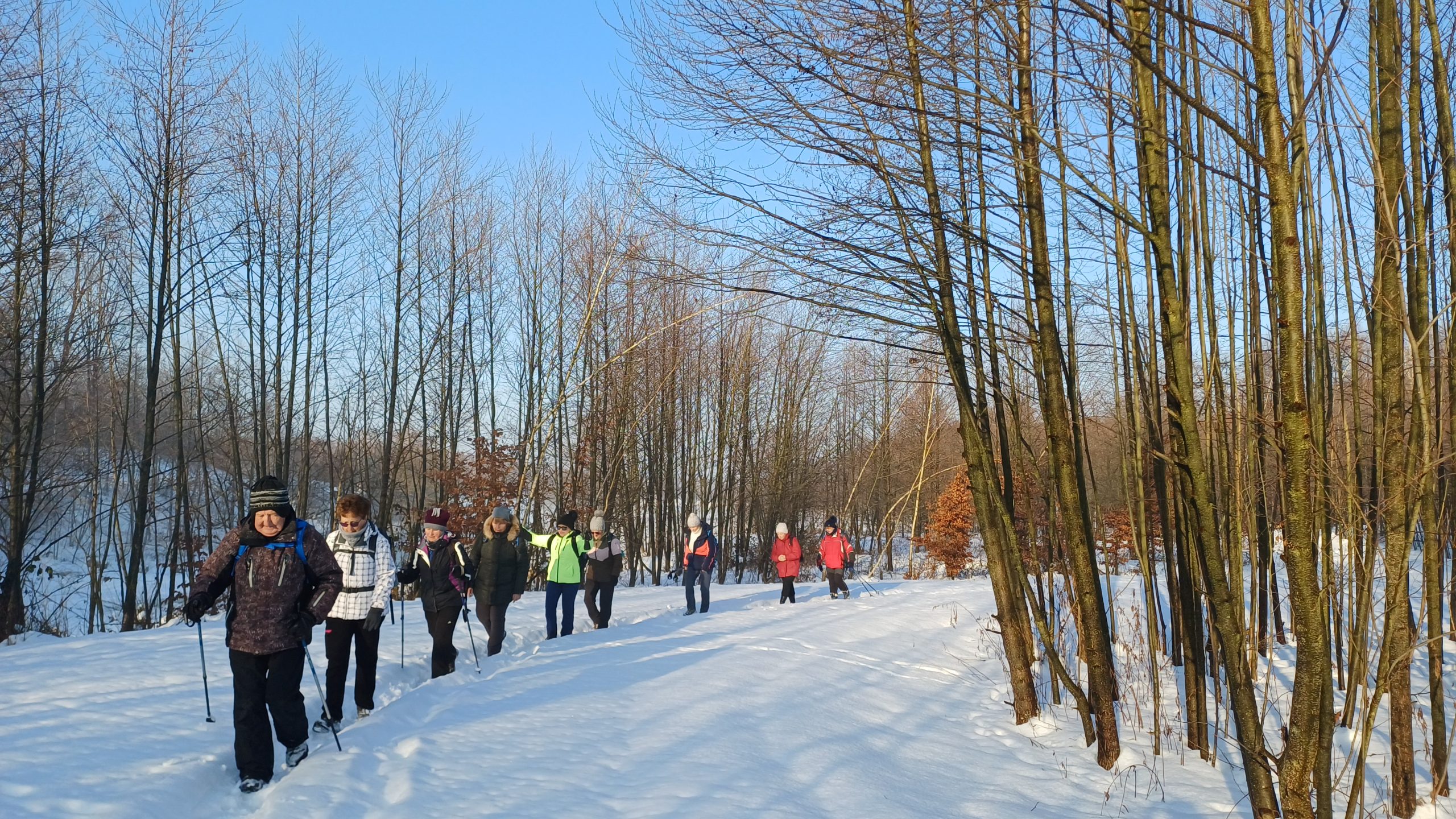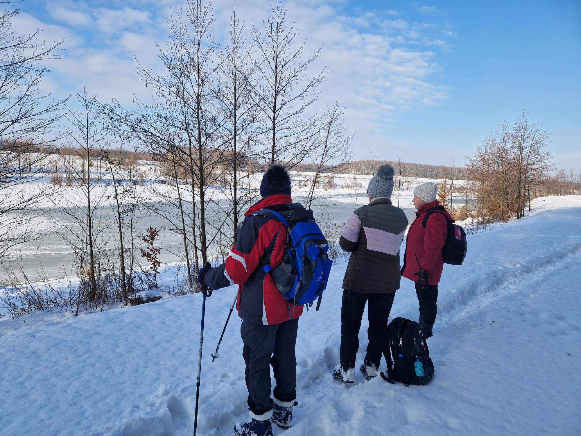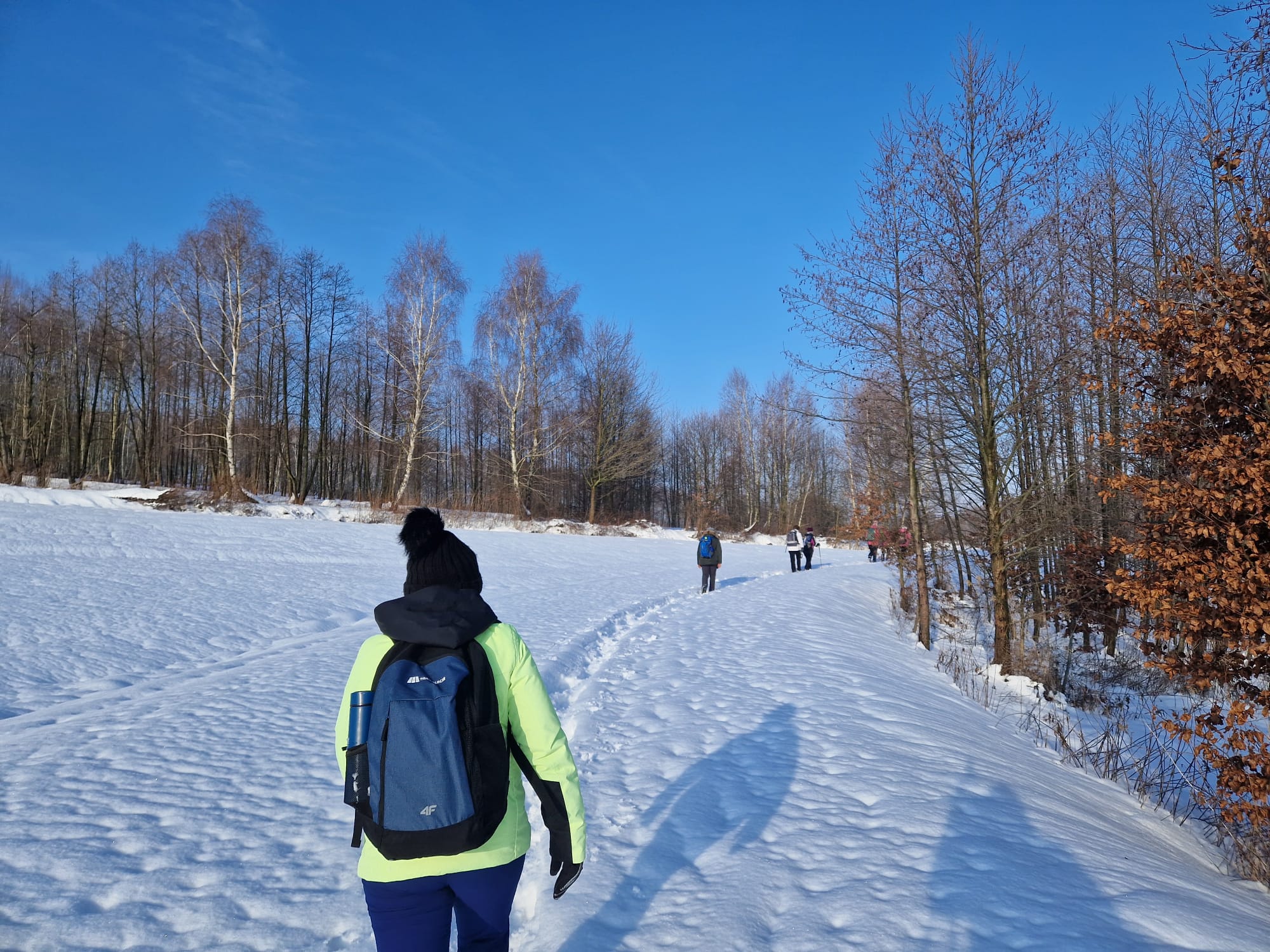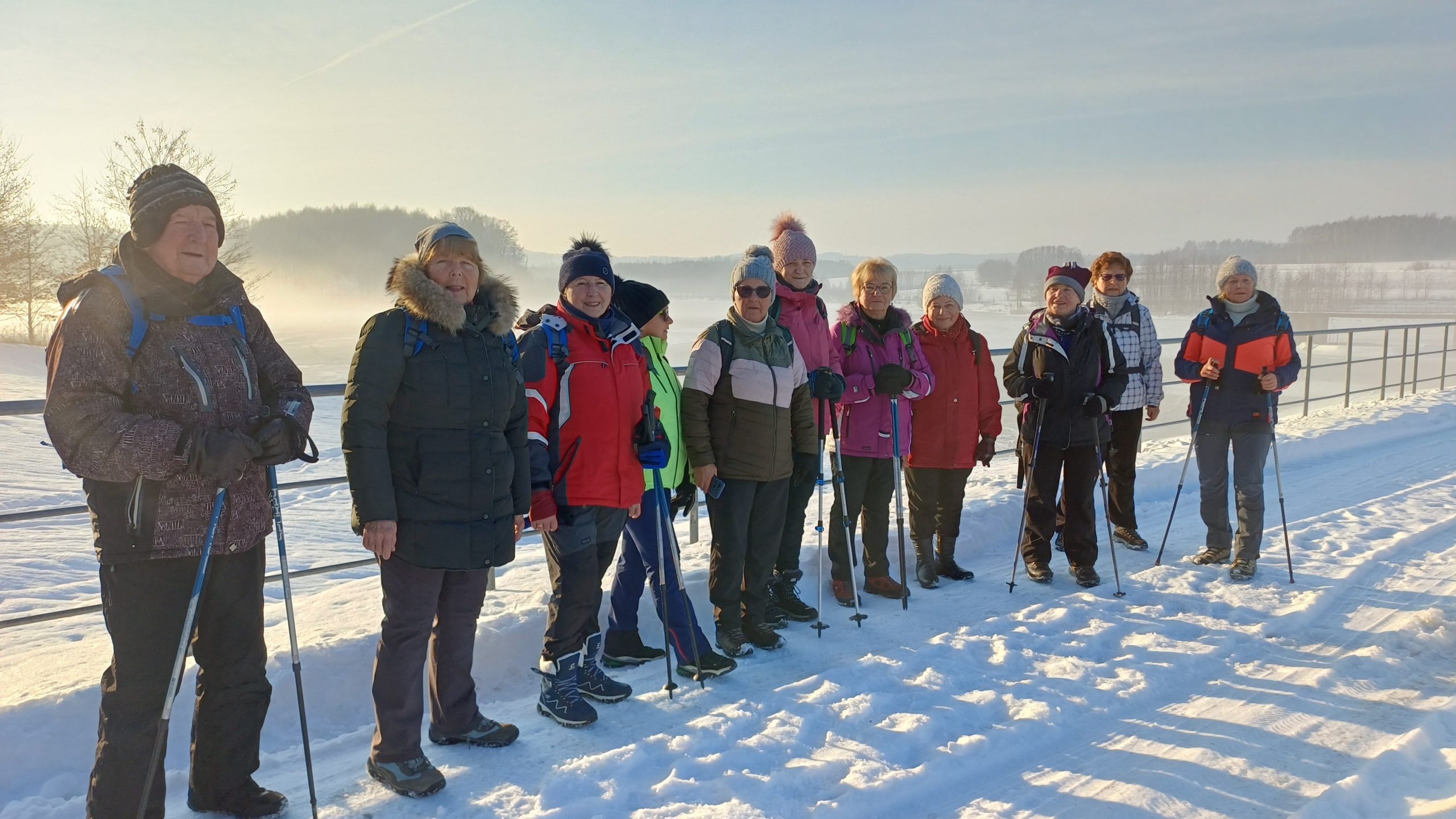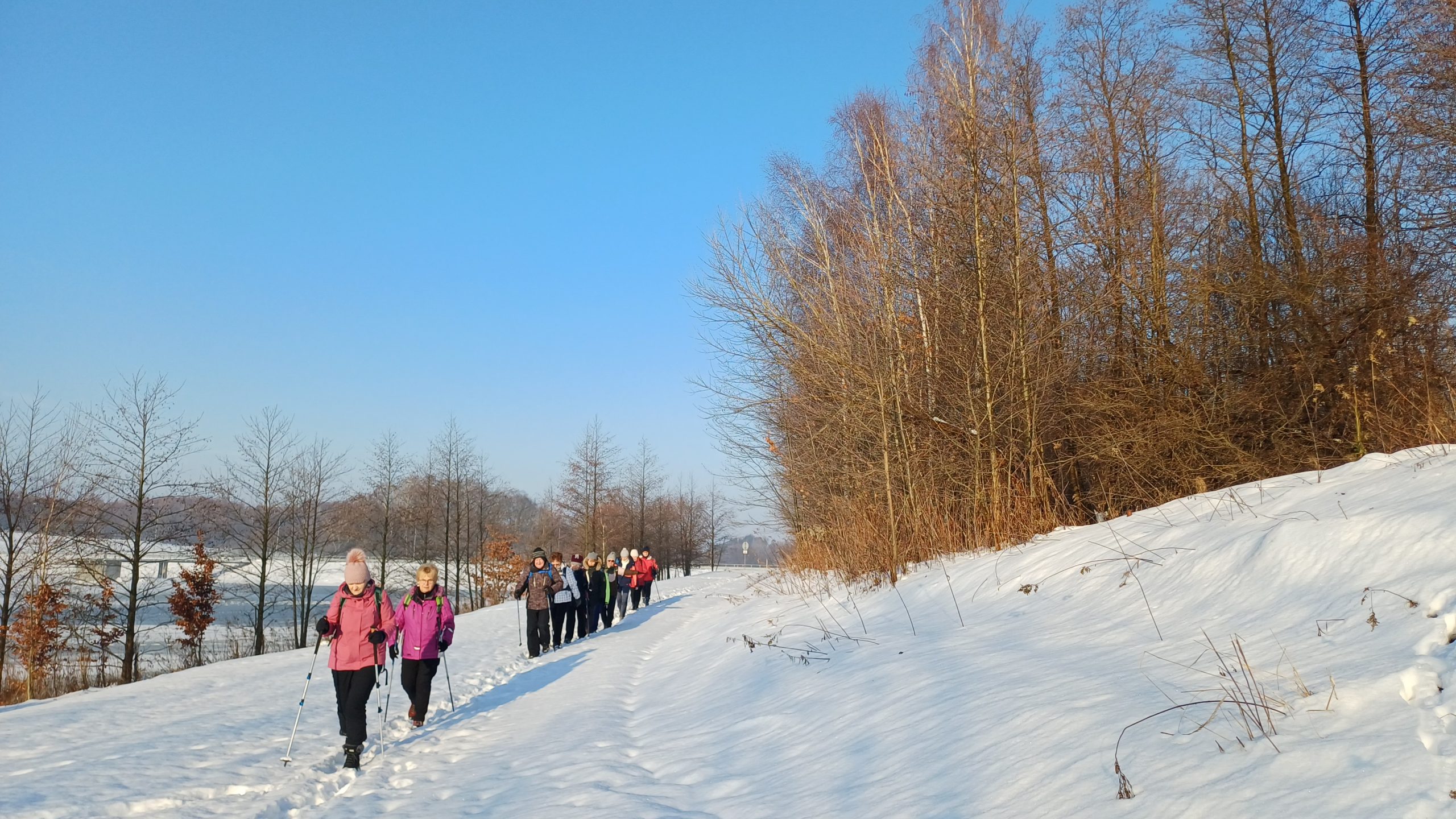 Łazikowanie w Nowym Roku 2026 rozpoczęliśmy od spaceru wokół zbiornika retencyjnego na Korzeniu w Skrzyszowie. Aura wymarzona na wycieczkę, rano lekki mróz i mgła nad zalewem, potem wyszło słońce, zrobiło się dużo cieplej, bez wiatru no i duużo śniegu. Początkowo była wydeptana ścieżka, ale później tylko ślady po jednej osobie i psie. Musiał to być mężczyzna, gdyż tropy na śniegu były w dużej odległości i czasami trudno było w nie trafić. Szliśmy więc gęsiego, najgorzej miała osoba idąca jako pierwsza, ale daliśmy radę. Natomiast dużo śladów zwierzyny leśnej zarówno na śniegu jak i na zamarzniętej tafli zalewu. Zrobiliśmy tylko jedną rundkę, ponieważ spacer był jednak trochę wyczerpujący. Za to z przyjemnością odpoczęliśmy na ławkach, delektując się smakowitościami w promieniach słońca. Na taką pierwszą wycieczkę przyszło 12 osób i zrobiliśmy tylko 7 kilometrów traktując ją jako rozgrzewkę przed następnymi wyzwaniami.