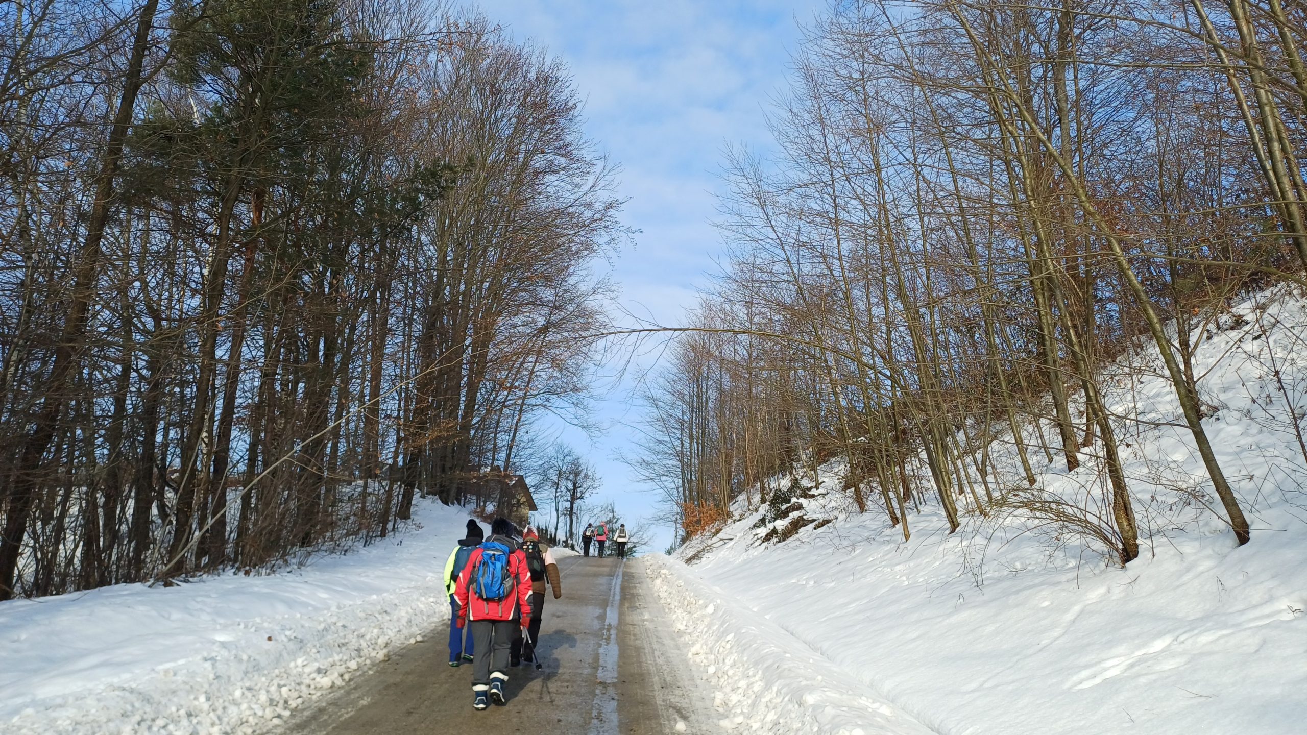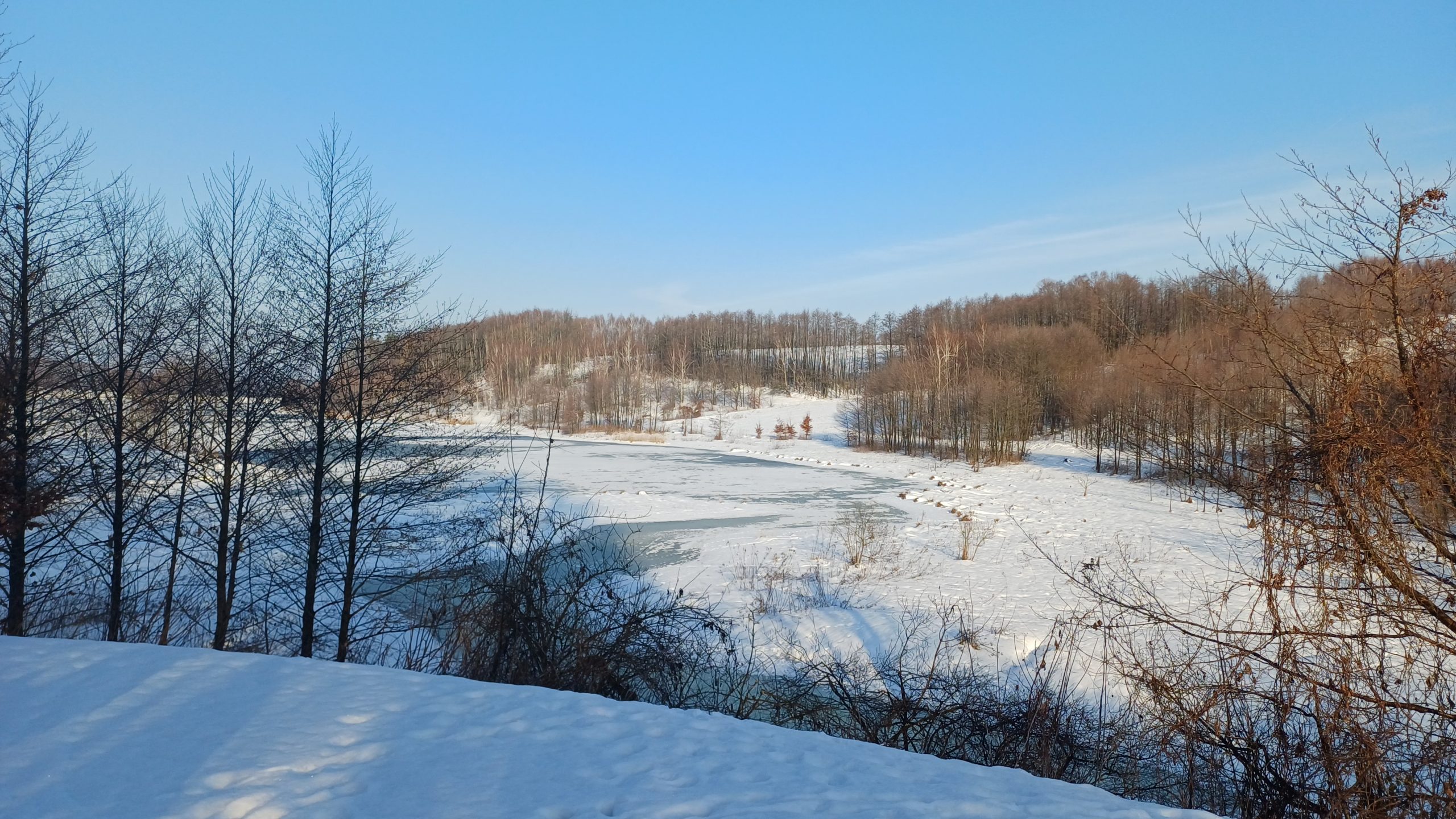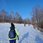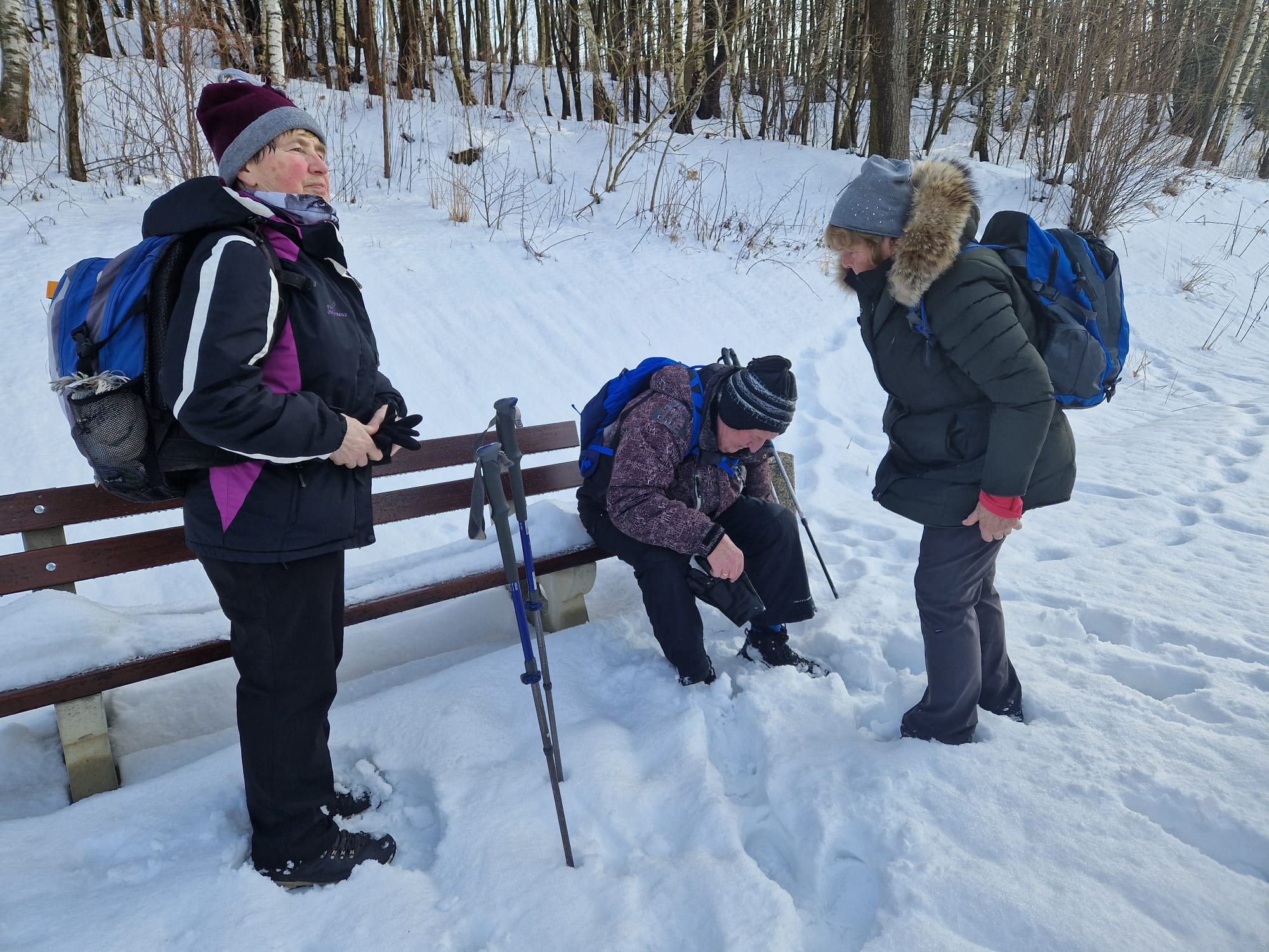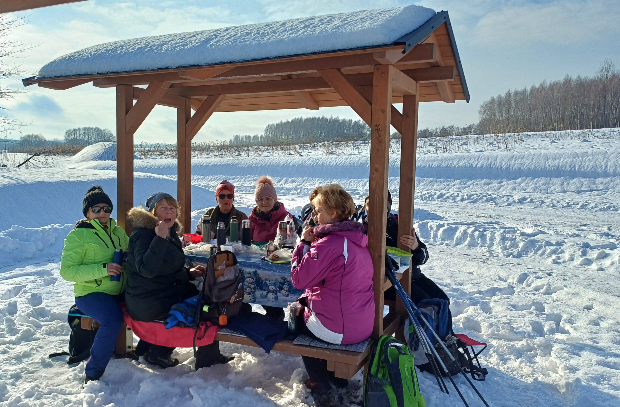 Łazikowanie w Nowym Roku 2026 rozpoczęliśmy od spaceru wokół zbiornika retencyjnego na Korzeniu w Skrzyszowie. Aura wymarzona na wycieczkę, rano lekki mróz i mgła nad zalewem, potem wyszło słońce, zrobiło się dużo cieplej, bez wiatru no i duużo śniegu. Początkowo była wydeptana ścieżka, ale później tylko ślady po jednej osobie i psie. Musiał to być mężczyzna, gdyż tropy na śniegu były w dużej odległości i czasami trudno było w nie trafić. Szliśmy więc gęsiego, najgorzej miała osoba idąca jako pierwsza, ale daliśmy radę. Natomiast dużo śladów zwierzyny leśnej zarówno na śniegu jak i na zamarzniętej tafli zalewu. Zrobiliśmy tylko jedną rundkę, ponieważ spacer był jednak trochę wyczerpujący. Za to z przyjemnością odpoczęliśmy na ławkach, delektując się smakowitościami w promieniach słońca. Na taką pierwszą wycieczkę przyszło 12 osób i zrobiliśmy tylko 7 kilometrów traktując ją jako rozgrzewkę przed następnymi wyzwaniami.