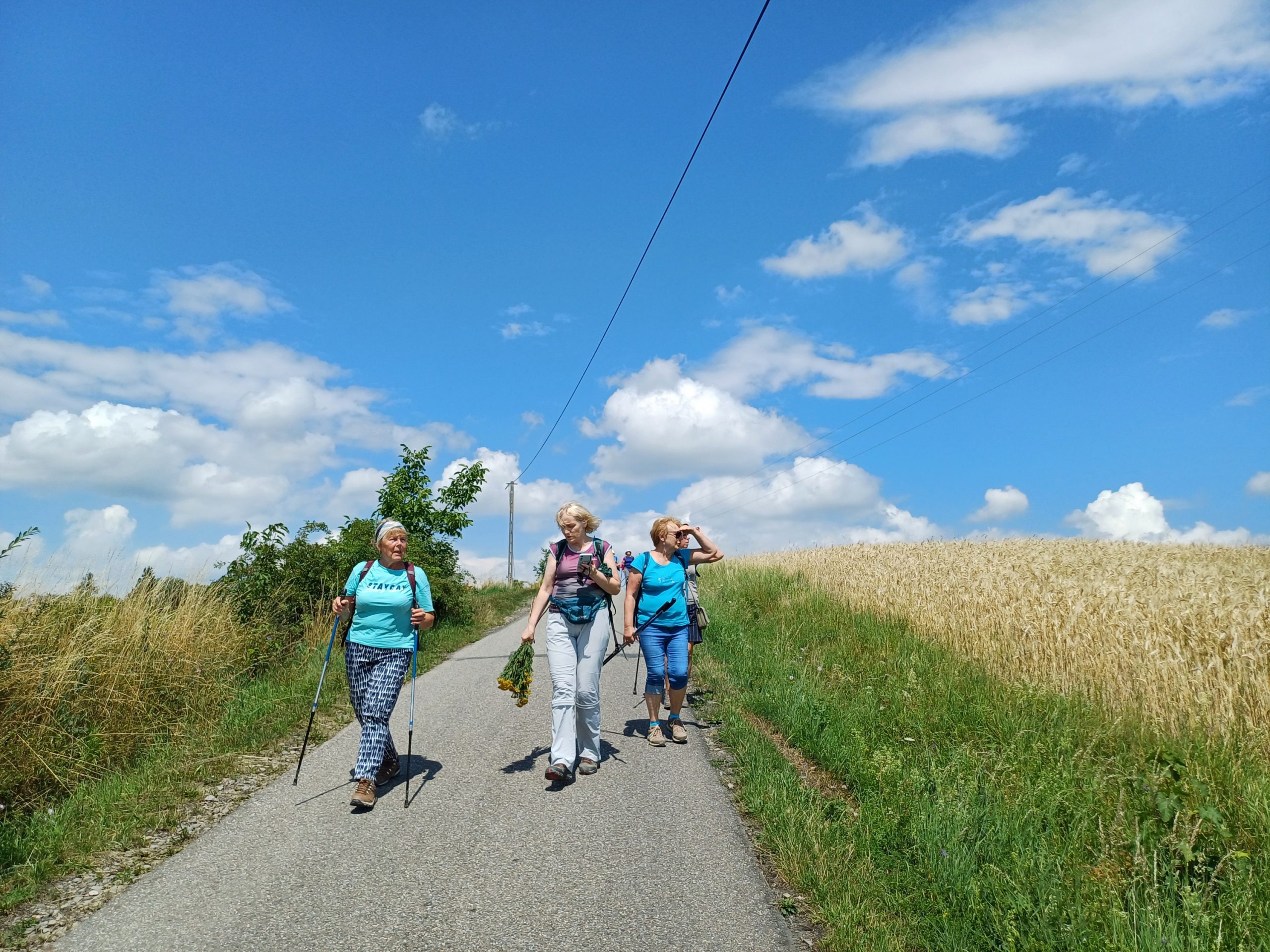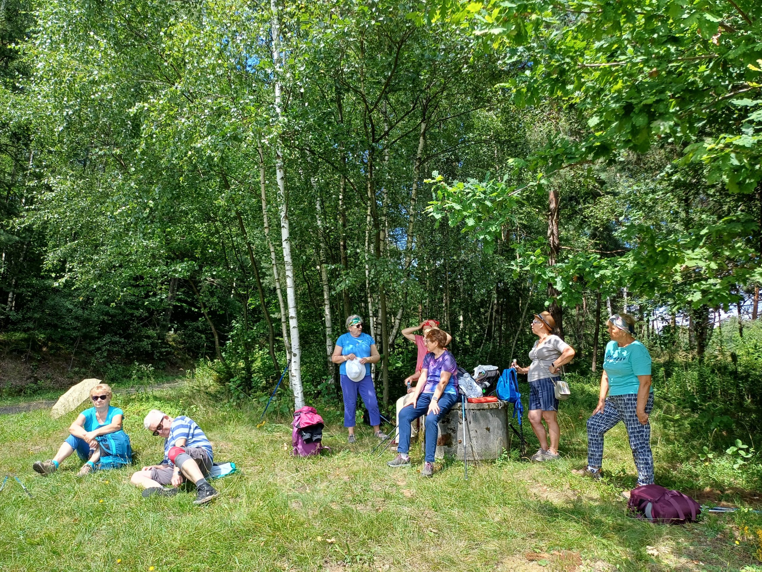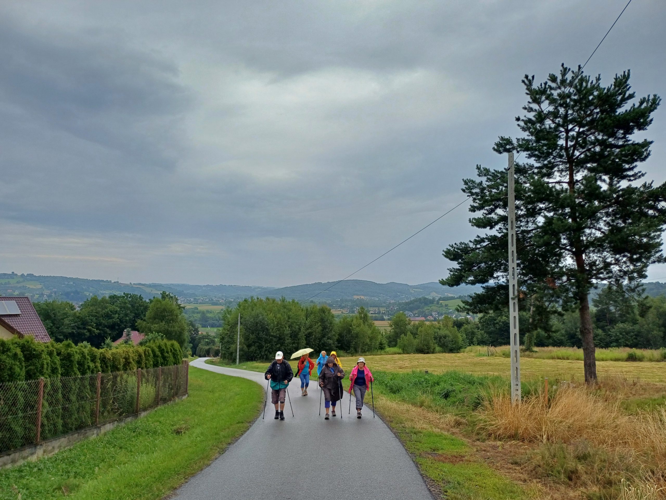 Pogoda spłatała nam małego figla, powitał nas rano mały, drobny deszczyk, który z przerwami towarzyszył nam do Policht. Grupa w liczbie 13 osób była przygotowana i na taką sytuację, więc nie zrezygnowaliśmy z zaplanowanej wycieczki, tylko ruszyliśmy na trasę. Po drodze zatrzymaliśmy się przy winnicy „Kuźnia” w miejscu przygotowanym na spotkania – fajne miejsce. Po przybyciu do Policht byliśmy mile zaskoczeni – po latach zastoju wreszcie Ośrodek Edukacji Ekologicznej tętni życiem. Rozlokowany jest tu obóz harcerski pod namiotami – grupa 46 harcerek i harcerzy ze Skawiny. Przypomniały nam się nasze wyjazdy na podobne obozy – jak to dawno było. Za zgodą komendanta obozu zatrzymaliśmy się pod wiatą na dłuższe śniadanie. Grzybów w lesie nie było wcale, za to kwitnie już wierzbówka i czerwieni się jarzębina. W drogę powrotną ruszyliśmy w kierunku Jastrzębi, a ponieważ mieliśmy dużo czasu do odjazdu busa, więc po drodze były przystanki na polanach z pięknymi widokami. Słońce na dobre zagościło na niebie, zrobiło się bardzo ciepło, więc z przyjemnością siedzieliśmy na trawie snując plany na następne wypady. Po przyjściu na przystanek okazało się, że jeszcze mamy sporo czasu, więc poszliśmy dalej, zwiedzając Jastrzębię, by zakończyć wędrówkę po 17 kilometrach.