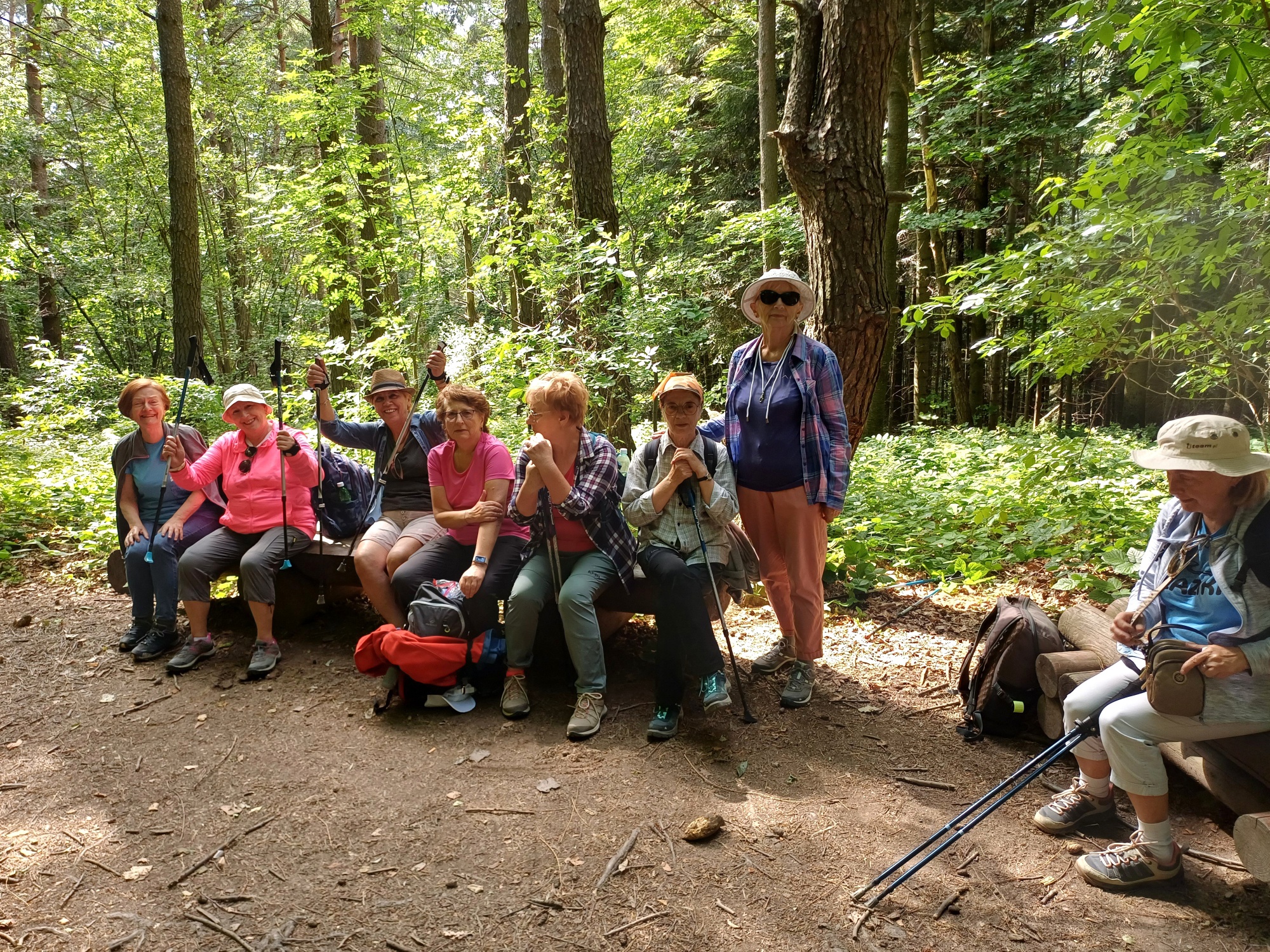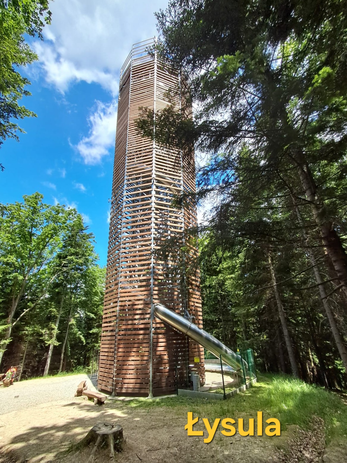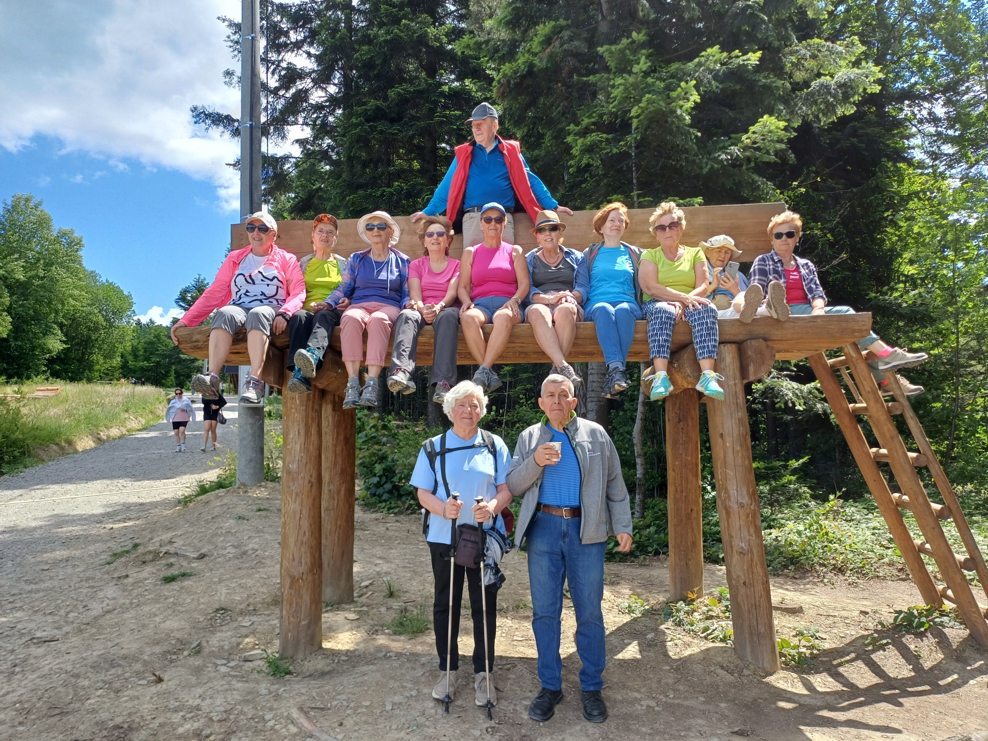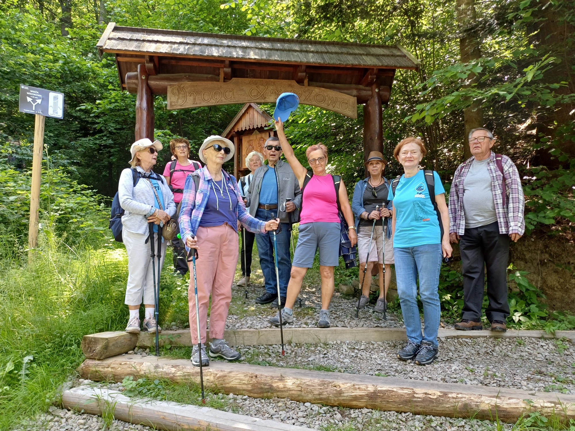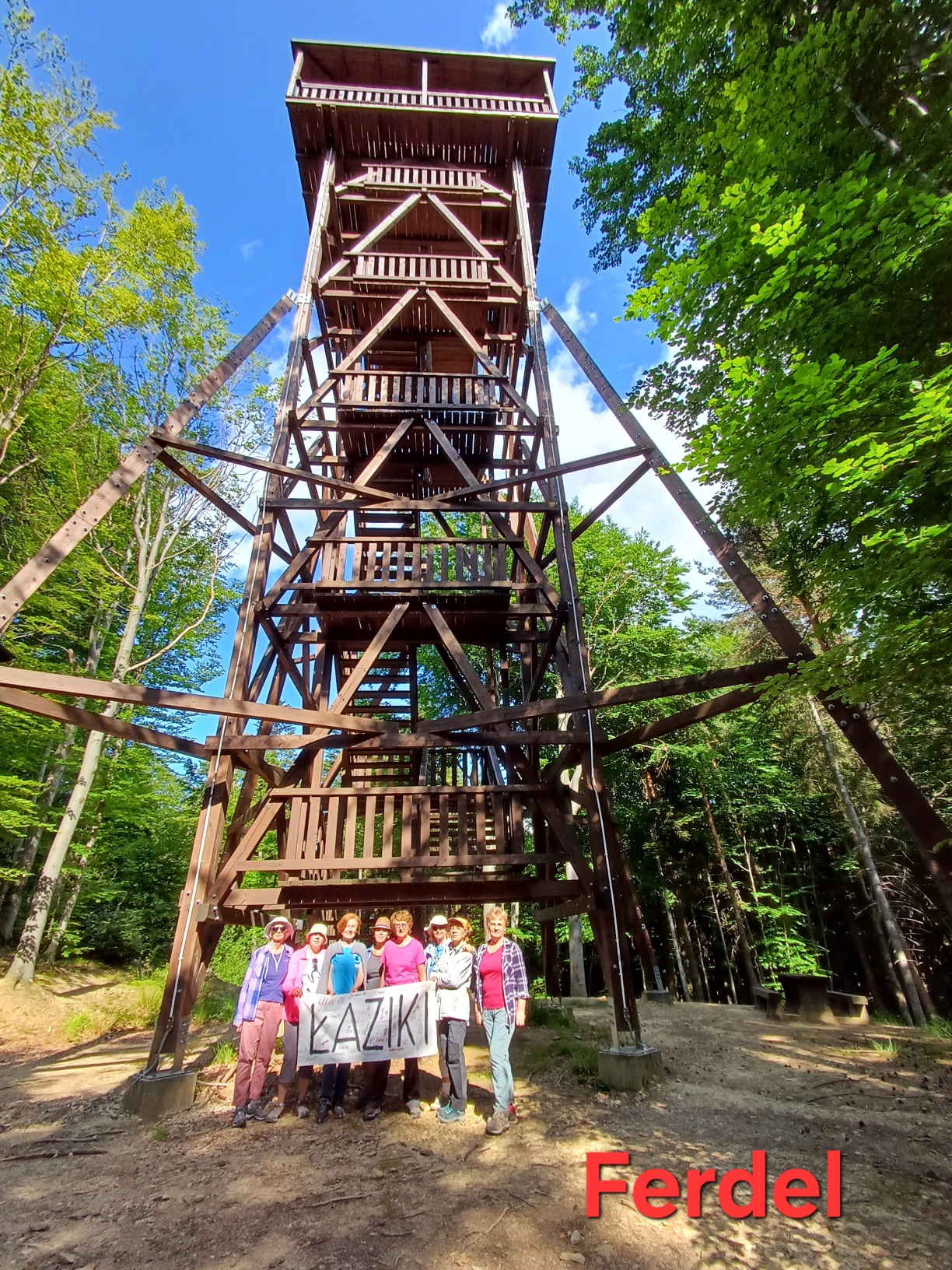 Planowana od roku wycieczka w Beskid Niski szlakiem pn „Dwie Wieże” wreszcie doczekała się realizacji. Grupą 14 osób z Dominikowic krótkim podejściem szybko osiągnęliśmy pierwszy szczyt Łysulę / 531 m n.p.m./, po drodze na krótko zatrzymując się na miejscu biwakowym z ” ławeczką ” i pięknym widokiem na okolicę. Na Łysuli znajduje się pierwsza z wież w kształcie walca – metalowa konstrukcja obudowana drewnem o wysokości 32 m ze 160 schodami do pokonania, aby znaleźć się na górnej platformie widokowej. Wieża góruje ponad koronami drzew, stąd też fantastyczne widoki. Wewnątrz wieży znajduje się atrakcja, czyli zjeżdżalnia zapewniająca 8 szalonych sekund, z których to większość z nas skorzystała. Po śniadaniu ruszamy w dalszą trasę, początkowo lasem, gdzie jedna z koleżanek znalazła cztery dorodne borowiki, by wyjść na przepiękną widokową ścieżkę biegnącą wzdłuż lasu i łąk, a potem między polami i łąkami. Pogoda wspaniała, słońce, ciepło i lekki wiatr i dobra widoczność umożliwiały nam wędrówkę i podziwianie nowych terenów. W Męcinie Wielkiej mijamy cmentarz z okresu I wojny światowej i wychodzimy wprost pod kościołem pw. św. Kosmy i Damiana / remont wieży i zamknięty kościół/. Po drodze koleżanki zbierały na łąkach kwiatki na wianki, potem je uplotły i wrzuciły do płynącego potoczku / jutro początek lata/. Po krótkim marszu dochodzimy do Wapiennego i wstępujemy na szybką kawę. Część osób zostaje w uzdrowisku a reszta rusza w dalszą trasę na następną wieżę. Cały czas idziemy lasem i pod górkę przez tzw. bukową dżunglę, podziwiając różne ciekawe drzewa bukowe. Mijamy Mały Ferdel i i niebawem jesteśmy na Ferdlu /648 m n.p.m./, gdzie jest wzniesiona druga wieża, trochę mniejsza od poprzedniej i jakże inna, cała z drewna i mierząca 25 m i 110 schodów. Widoki z wieży również wspaniałe. Z uwagi na ścinkę drzew musimy iść tą samą trasą, a nie zatoczyć pętli wokół Ferdla. Szybko schodzimy do Wapiennego do regionalnej „Pierogarni pod Ferdlem”, gdzie są serwowane różnego rodzaju pierogi, które smakowały wybornie, jak i zimne piwo z pobliskiego browaru. Wystrój wnętrza urokliwy, szkoda tylko że nie mieliśmy więcej czasu na odpoczynek w tym miejscu. A i kilometrów też było sporo, bo aż 19.