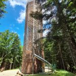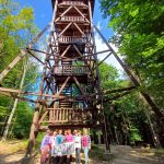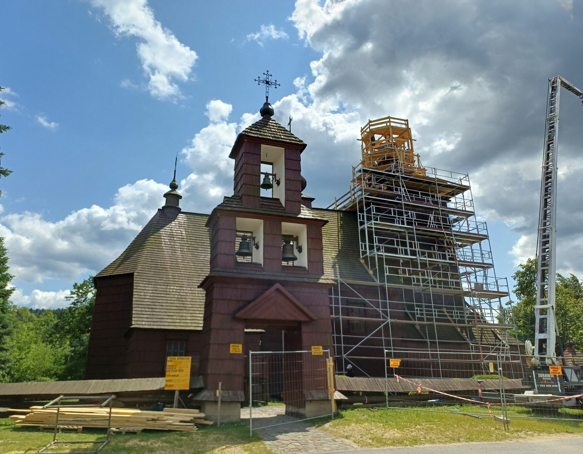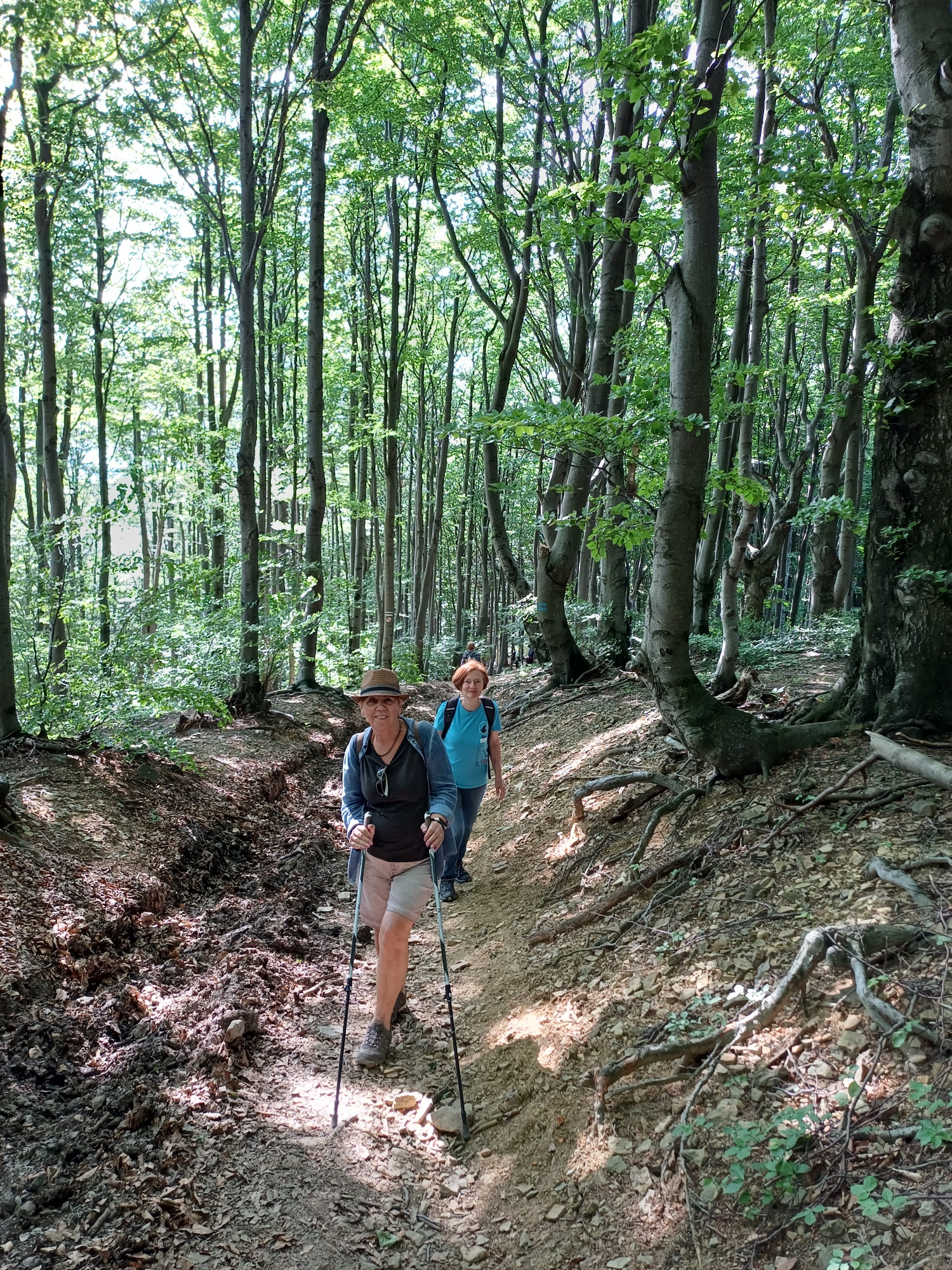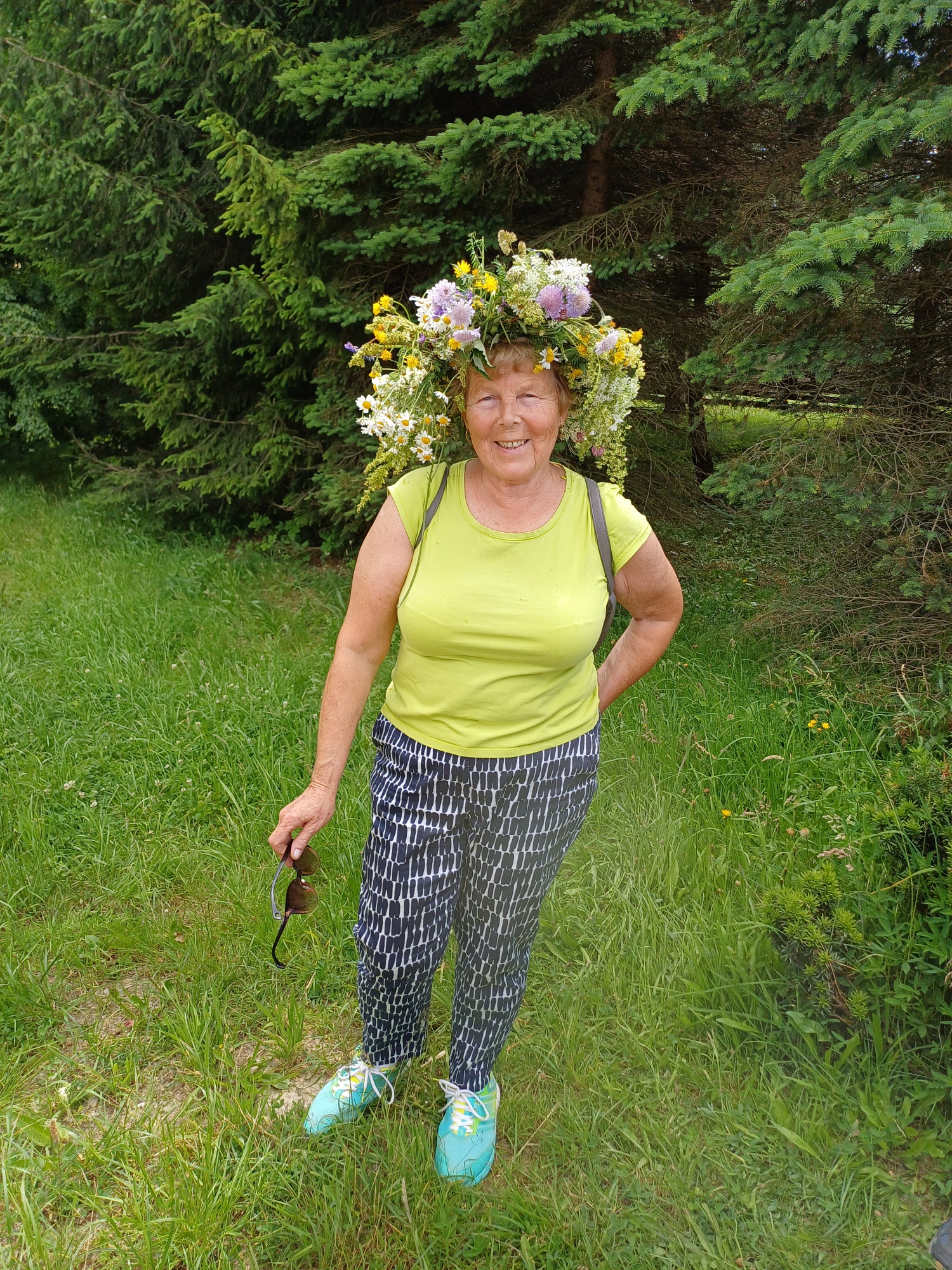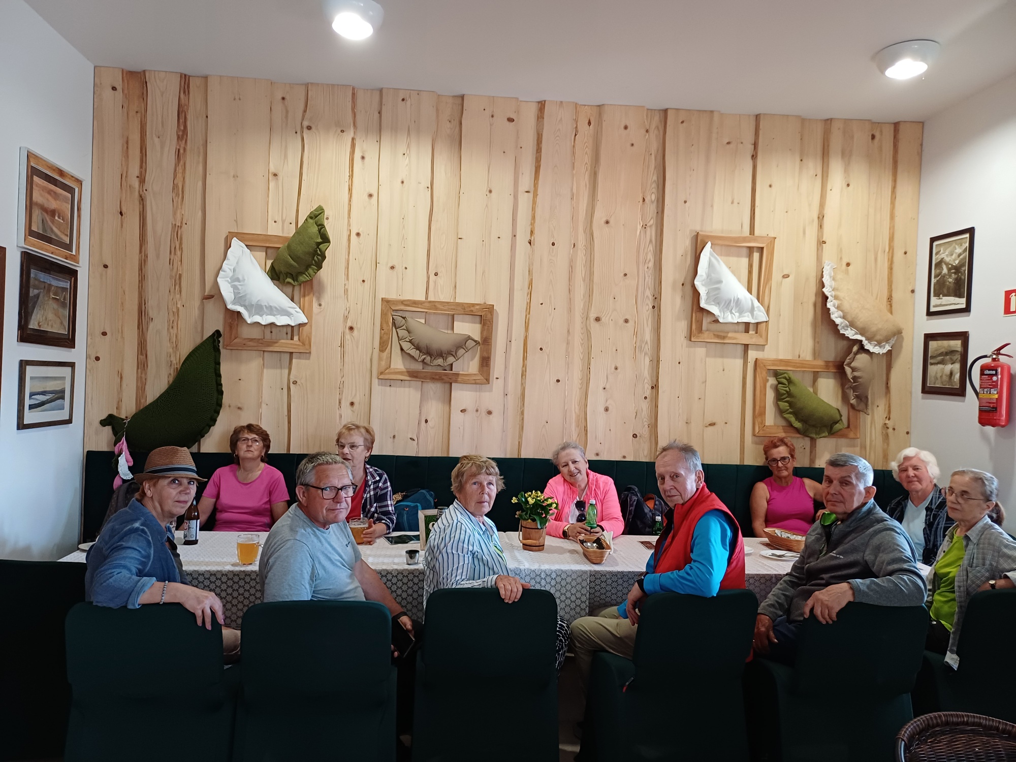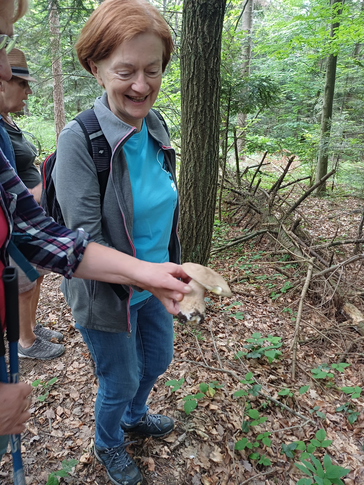 Planowana od roku wycieczka w Beskid Niski szlakiem pn „Dwie Wieże” wreszcie doczekała się realizacji. Grupą 14 osób z Dominikowic krótkim podejściem szybko osiągnęliśmy pierwszy szczyt Łysulę / 531 m n.p.m./, po drodze na krótko zatrzymując się na miejscu biwakowym z ” ławeczką ” i pięknym widokiem na okolicę. Na Łysuli znajduje się pierwsza z wież w kształcie walca – metalowa konstrukcja obudowana drewnem o wysokości 32 m ze 160 schodami do pokonania, aby znaleźć się na górnej platformie widokowej. Wieża góruje ponad koronami drzew, stąd też fantastyczne widoki. Wewnątrz wieży znajduje się atrakcja, czyli zjeżdżalnia zapewniająca 8 szalonych sekund, z których to większość z nas skorzystała. Po śniadaniu ruszamy w dalszą trasę, początkowo lasem, gdzie jedna z koleżanek znalazła cztery dorodne borowiki, by wyjść na przepiękną widokową ścieżkę biegnącą wzdłuż lasu i łąk, a potem między polami i łąkami. Pogoda wspaniała, słońce, ciepło i lekki wiatr i dobra widoczność umożliwiały nam wędrówkę i podziwianie nowych terenów. W Męcinie Wielkiej mijamy cmentarz z okresu I wojny światowej i wychodzimy wprost pod kościołem pw. św. Kosmy i Damiana / remont wieży i zamknięty kościół/. Po drodze koleżanki zbierały na łąkach kwiatki na wianki, potem je uplotły i wrzuciły do płynącego potoczku / jutro początek lata/. Po krótkim marszu dochodzimy do Wapiennego i wstępujemy na szybką kawę. Część osób zostaje w uzdrowisku a reszta rusza w dalszą trasę na następną wieżę. Cały czas idziemy lasem i pod górkę przez tzw. bukową dżunglę, podziwiając różne ciekawe drzewa bukowe. Mijamy Mały Ferdel i i niebawem jesteśmy na Ferdlu /648 m n.p.m./, gdzie jest wzniesiona druga wieża, trochę mniejsza od poprzedniej i jakże inna, cała z drewna i mierząca 25 m i 110 schodów. Widoki z wieży również wspaniałe. Z uwagi na ścinkę drzew musimy iść tą samą trasą, a nie zatoczyć pętli wokół Ferdla. Szybko schodzimy do Wapiennego do regionalnej „Pierogarni pod Ferdlem”, gdzie są serwowane różnego rodzaju pierogi, które smakowały wybornie, jak i zimne piwo z pobliskiego browaru. Wystrój wnętrza urokliwy, szkoda tylko że nie mieliśmy więcej czasu na odpoczynek w tym miejscu. A i kilometrów też było sporo, bo aż 19.