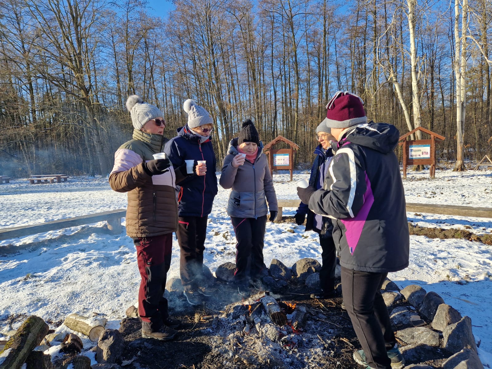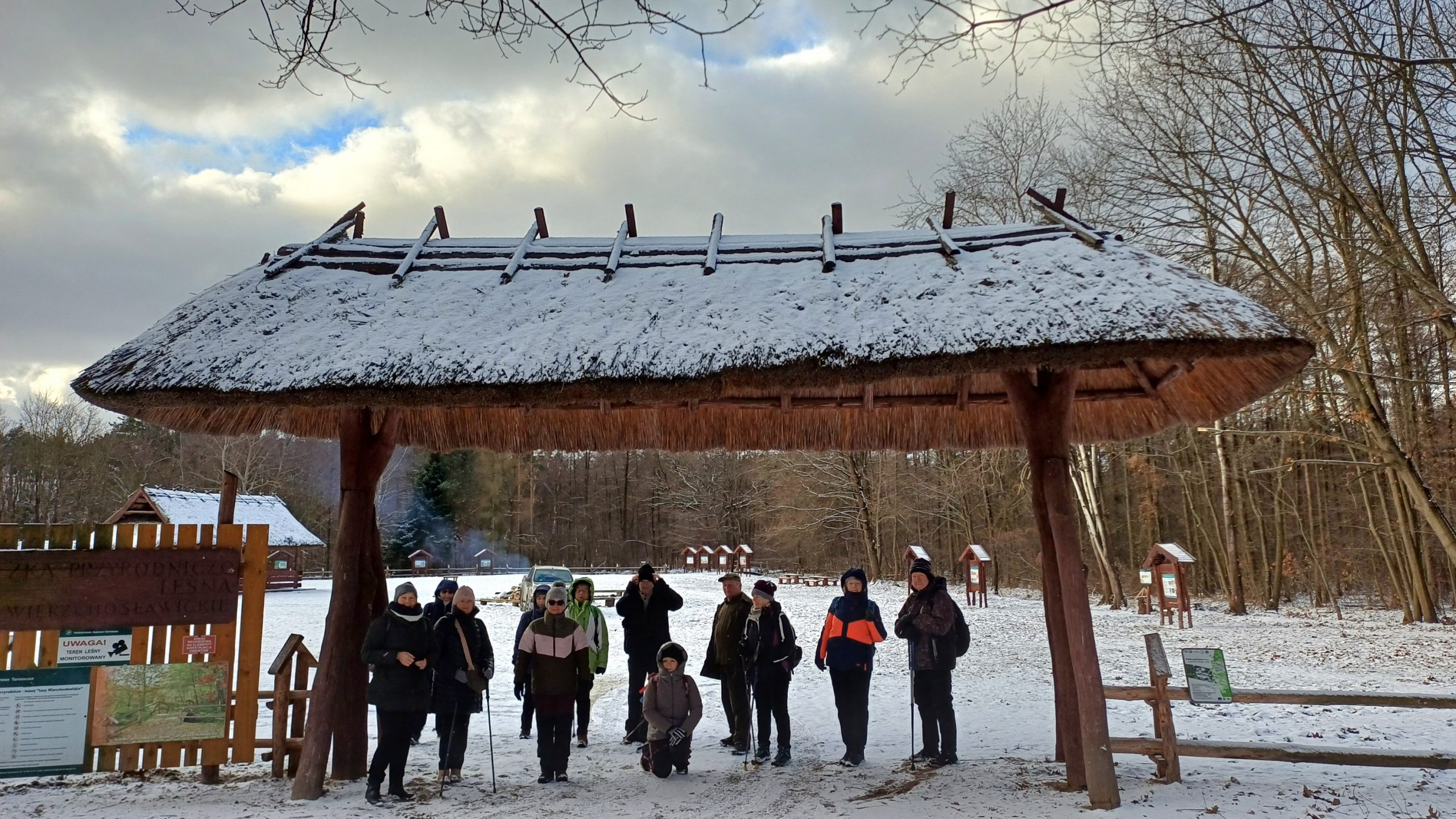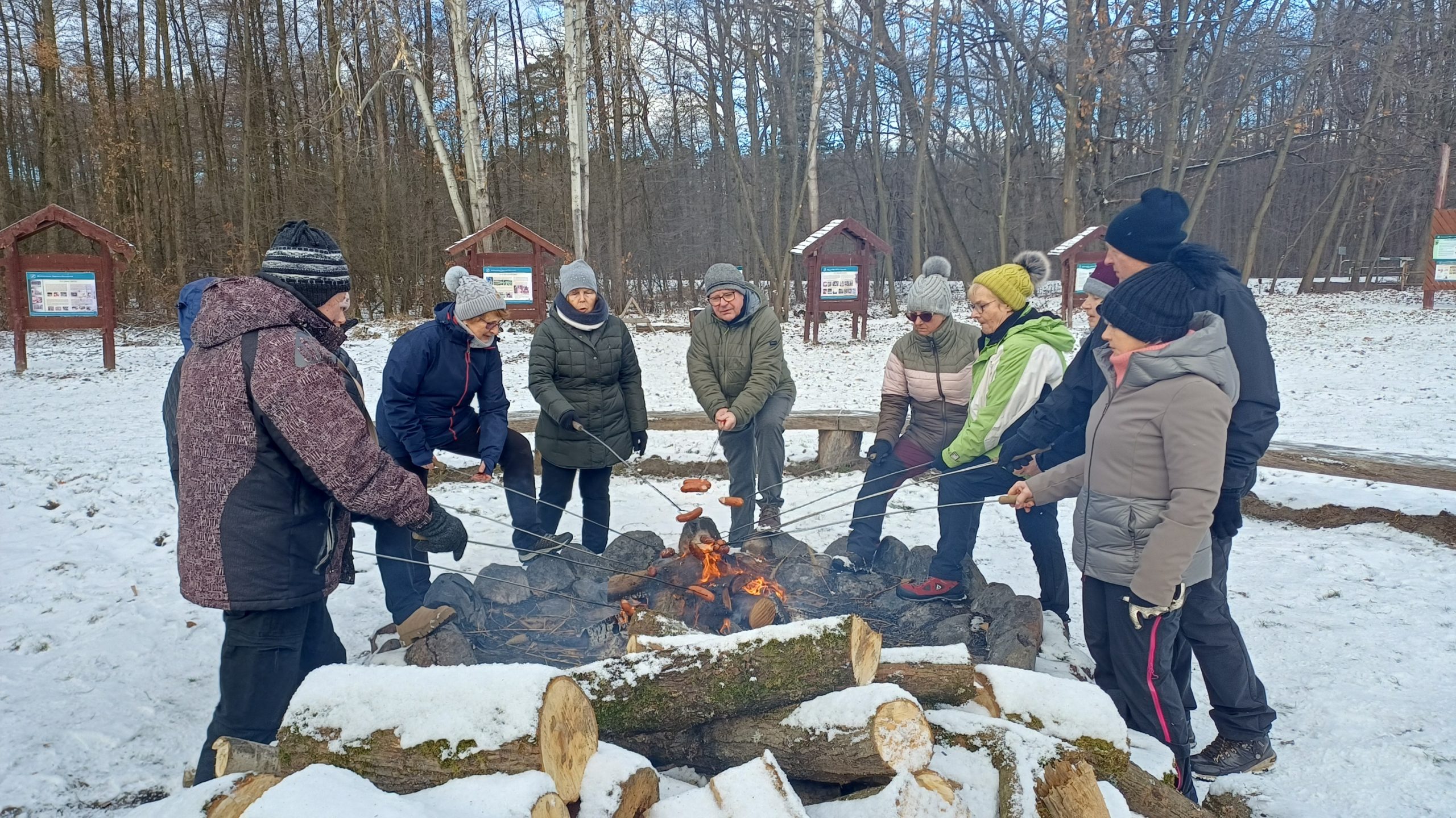 Kończymy 2025 r. spotkaniem przy ognisku na polanie biwakowej w lasach Wierzchosławickich, podobnie jak ten rok zaczynaliśmy. Jak zawsze było świetnie, humory dopisywały, pogoda też była łaskawa, lekki mróz i słońce, choć czasami wiał silny wiatr, no i wokół było biało, prawdziwa zima. Ogrzewaliśmy się przy zapalonym ognisku, a na rozgrzewkę był gorący żurek i pieczone kiełbaski.