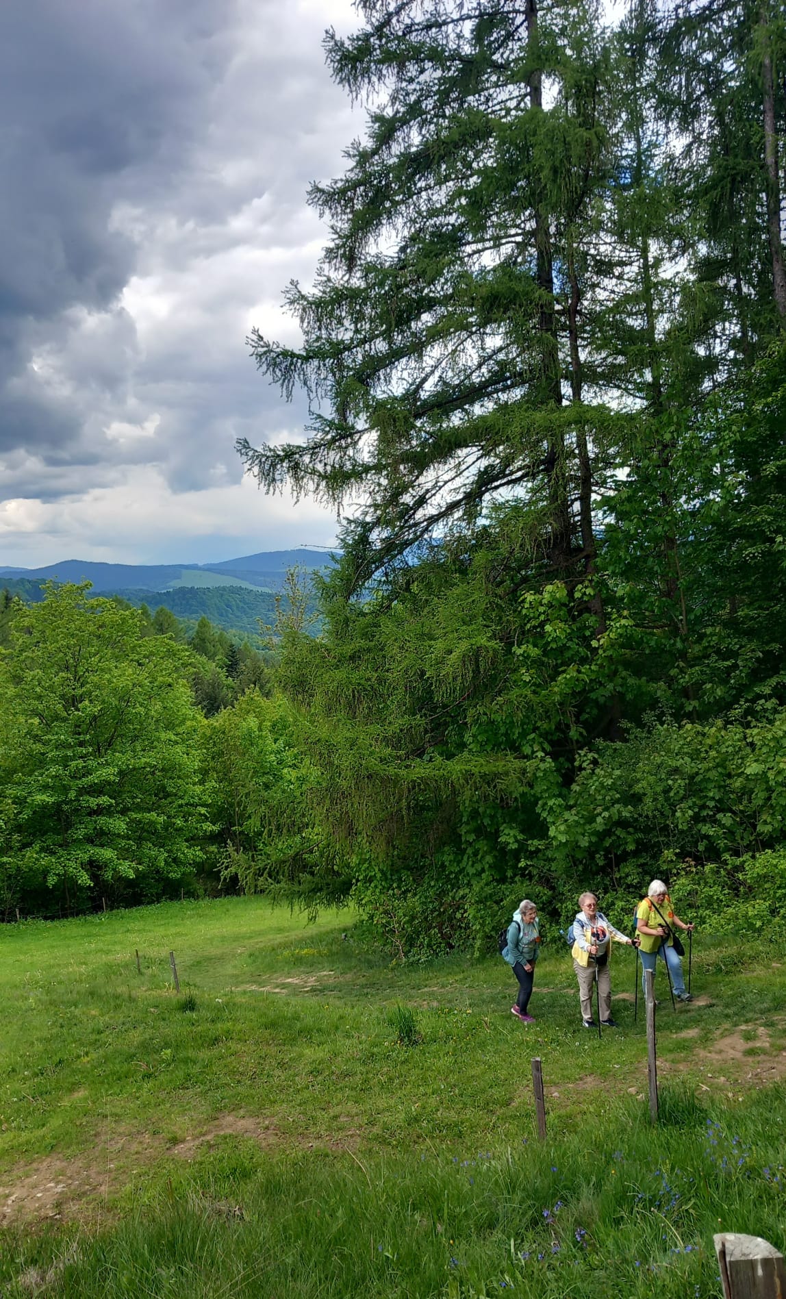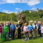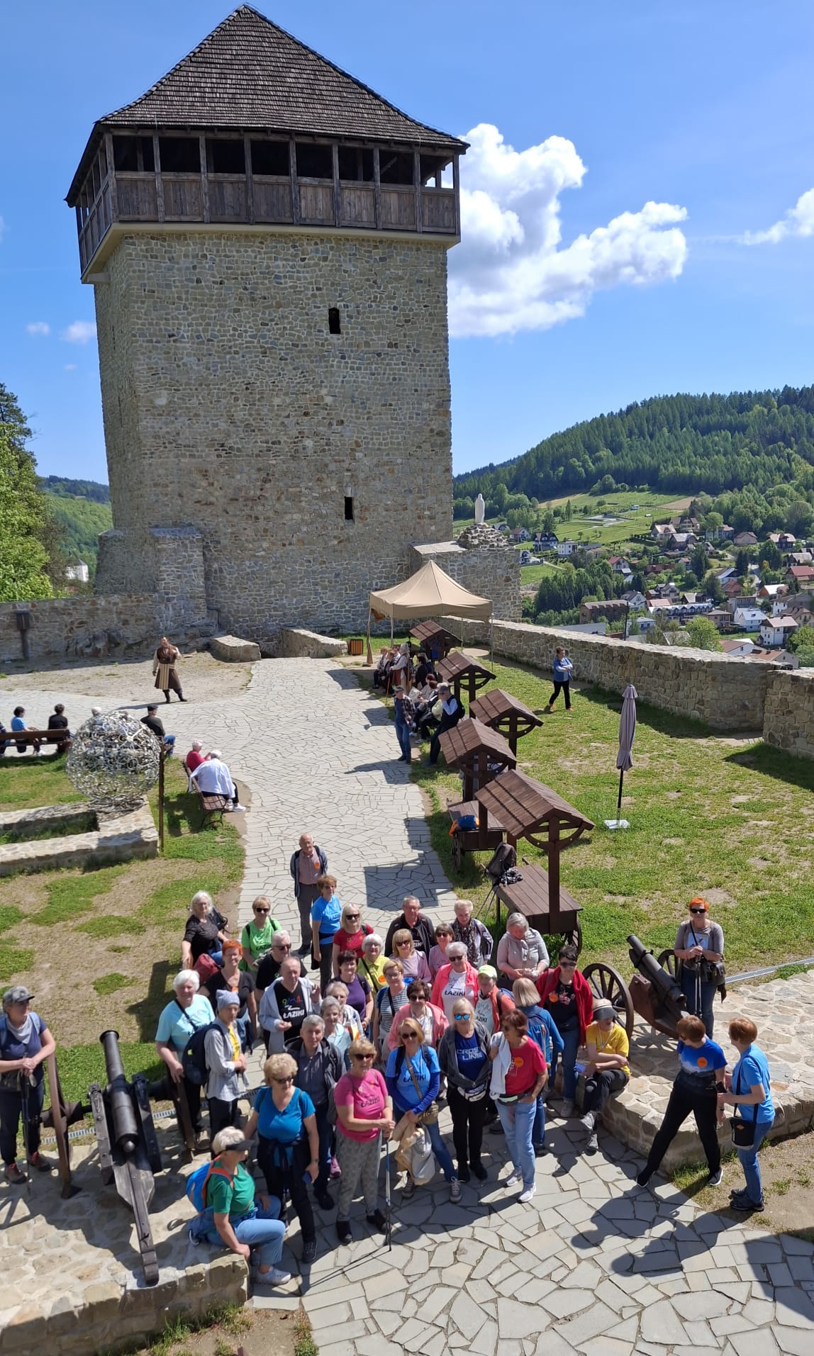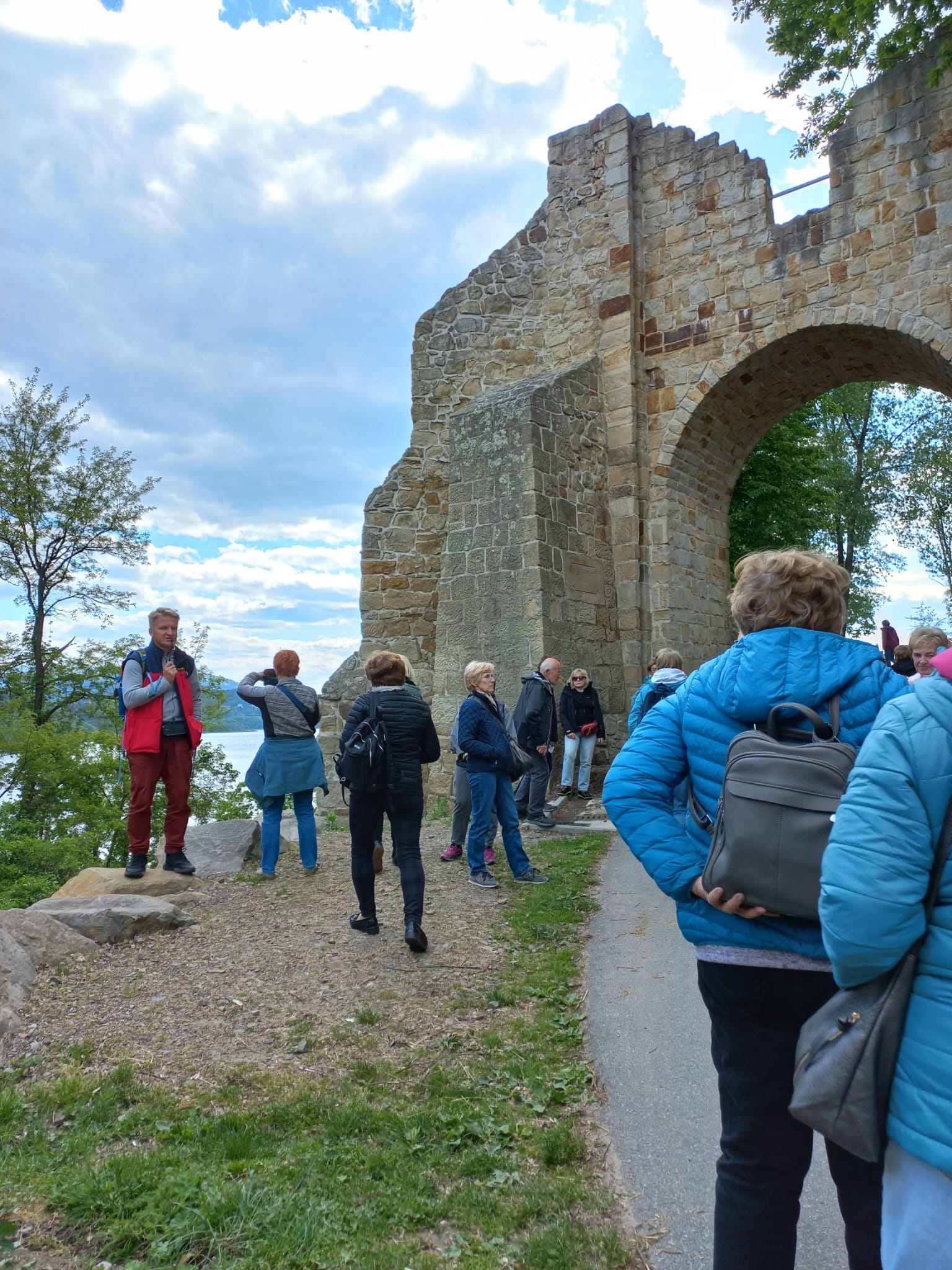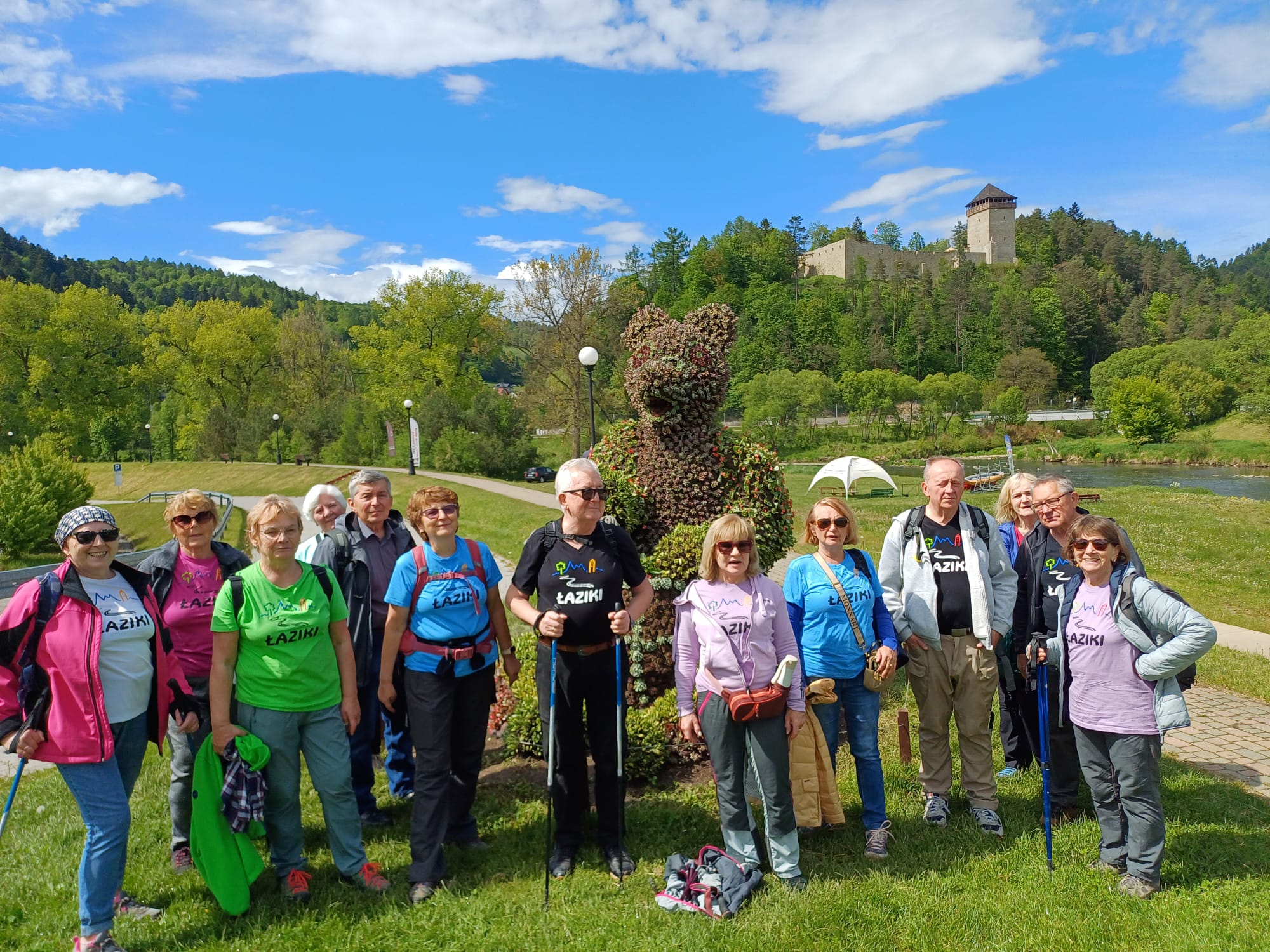 Gdy przyjechaliśmy na miejsce, całą grupą 51 osób poszliśmy na wzgórze Baszta na teren częściowo zrekonstruowanych ruin Zamku pochodzącego z XVw. a oddanego do zwiedzania indywidualnego lub z przewodnikiem w 2024 r. Z tarasu, gdzie znajduje się bardzo sympatyczna kawiarenka, można podziwiać piękny widok na Dolinę Popradu. Po krótkim pobycie na terenie ruin, nasza wycieczka podzieliła się na trzy grupy. Łaziki i Trampy z chętnymi koleżankami wybrały się na górę Malnik a pozostali uczestnicy zostali w mieście, zwiedzając Muszynę oraz Ogrody Sensoryczne i Ogrody Biblijne.