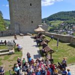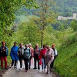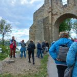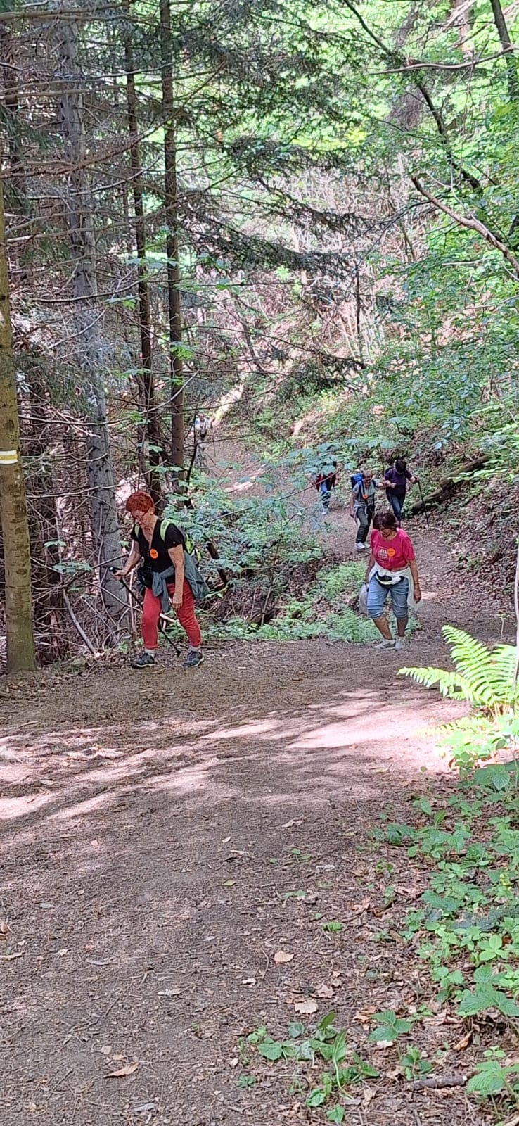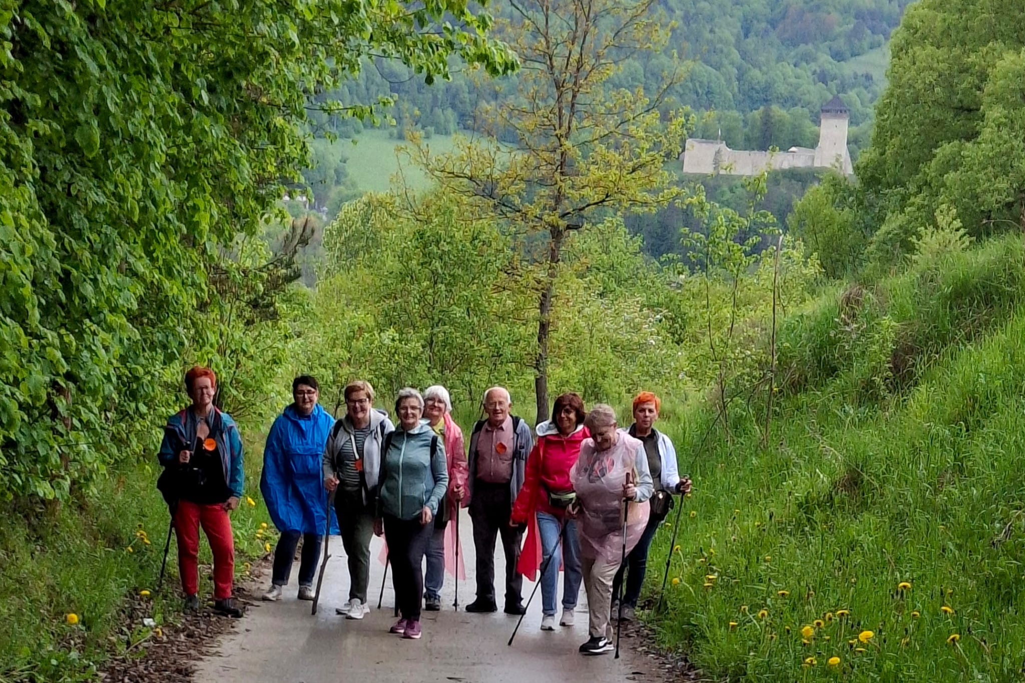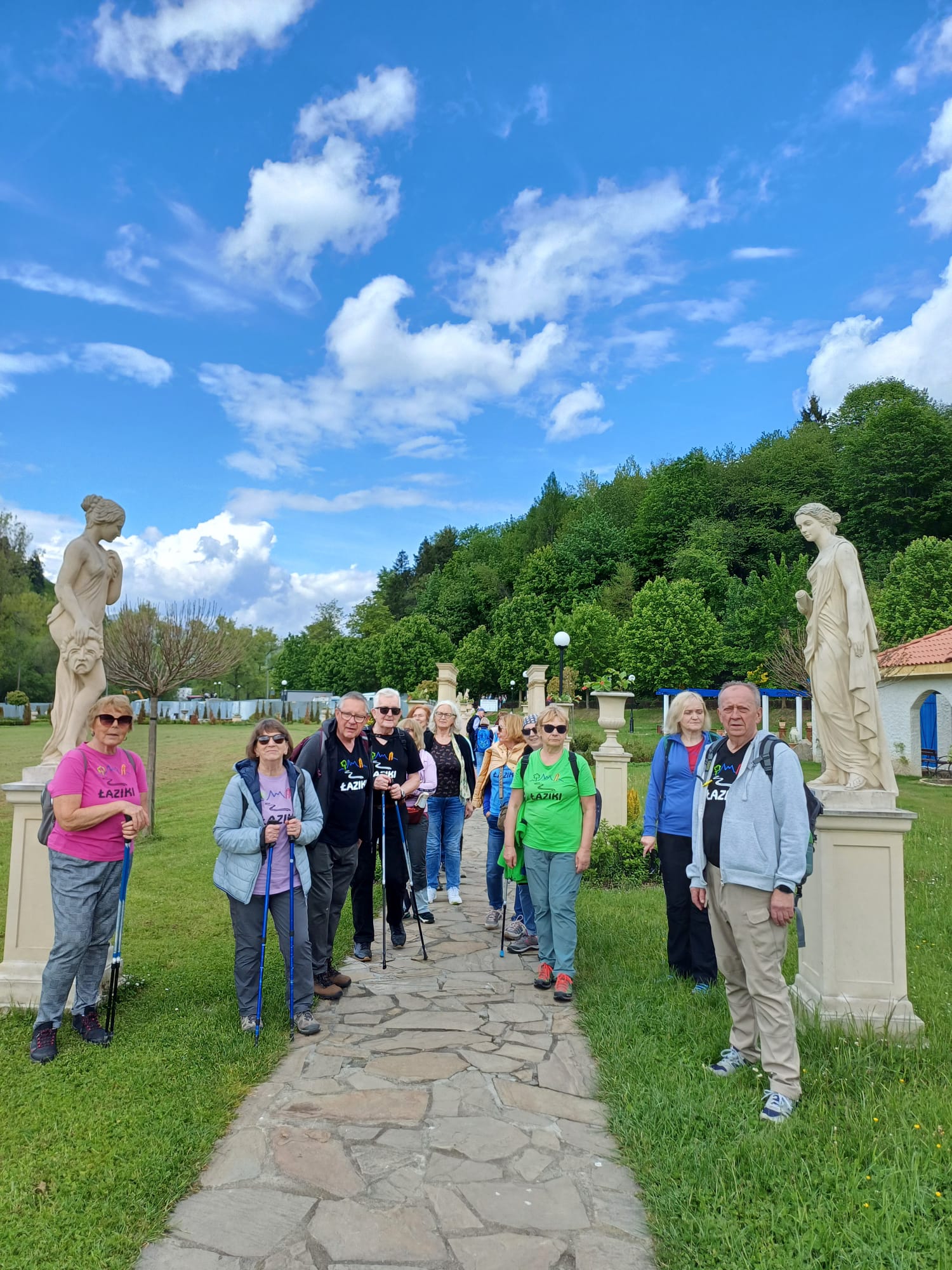 Gdy przyjechaliśmy na miejsce, całą grupą 51 osób poszliśmy na wzgórze Baszta na teren częściowo zrekonstruowanych ruin Zamku pochodzącego z XVw. a oddanego do zwiedzania indywidualnego lub z przewodnikiem w 2024 r. Z tarasu, gdzie znajduje się bardzo sympatyczna kawiarenka, można podziwiać piękny widok na Dolinę Popradu. Po krótkim pobycie na terenie ruin, nasza wycieczka podzieliła się na trzy grupy. Łaziki i Trampy z chętnymi koleżankami wybrały się na górę Malnik a pozostali uczestnicy zostali w mieście, zwiedzając Muszynę oraz Ogrody Sensoryczne i Ogrody Biblijne.