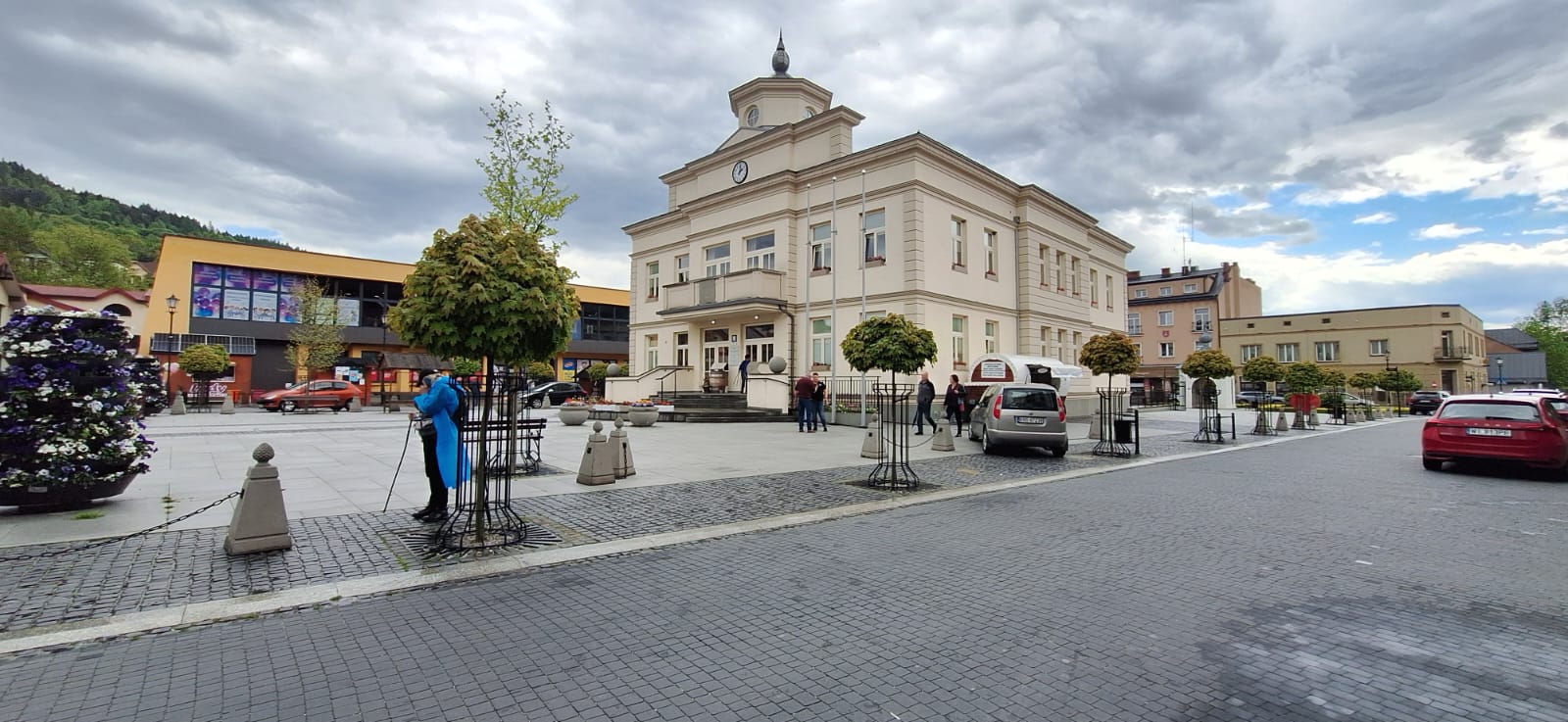 Po zejściu z góry, stwierdziliśmy że chętnie byśmy coś zjedli…ale przechodząc przez rynek, wstąpiliśmy do pięknego Ratusza. Na rynku jeszcze kilkanaście lat temu był parking… były jednak ukryte podziemia i w czasie prac archeologicznych w 2015 r. odkryto i odtworzono więzienie i salę tortur (z wyposażeniem). Ratusz nawiązuje do stylu galicyjskiego z XIX w a został wybudowany w miejscu gdzie znajdowała się dawna siedziba władz uzdrowiska, która spłonęła w XIX w.