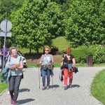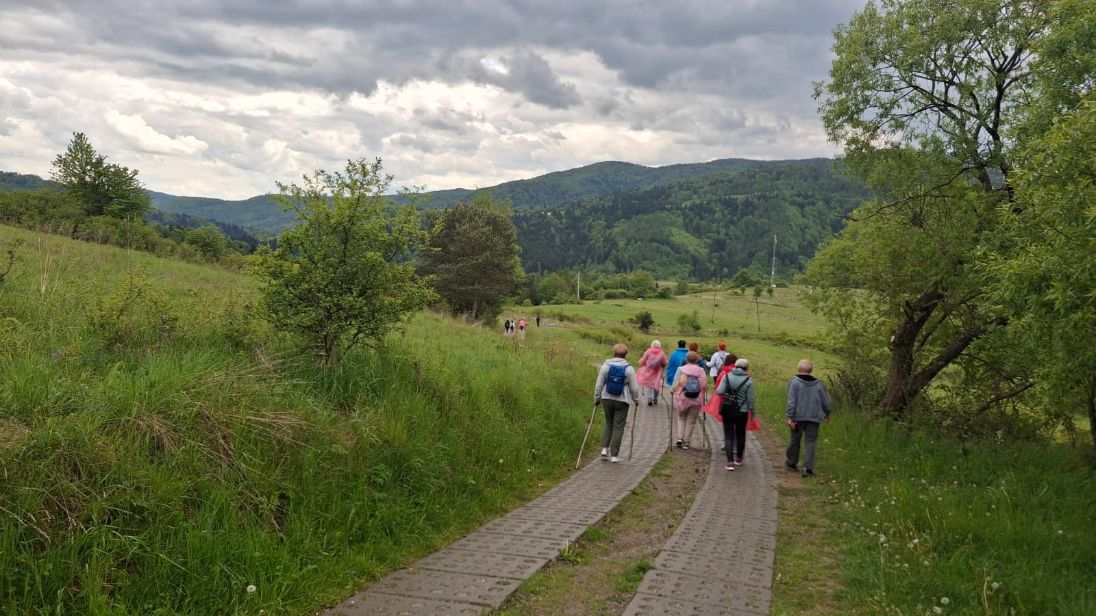 Maślana Góra zdobyta, no może górka , bo to tylko 753 m n.p.m. Ale po kolei, pociągiem Grupa Łaziki należąca do Uniwersytetu Trzeciego Wieku przy Akademii Tarnowskiej udała się do Stróż, gdzie zwiedzili kościół, którego wnętrze po remoncie przyciągało niezwykłą skromnością i czystością. Ściany ozdobione przepięknymi kolorowymi dekoracjami w kształcie palm wykonane przez mieszkańców, skromny ołtarz główny, ciekawa droga krzyżowa i piękna posadzka. Spotkany ksiądz opowiedział o najnowszej historii kościoła. Następnie Seniorzy udali się Wyskitnej na miejsce biwakowe. W jednym z przydomowych ogródków zobaczyli duży, ciekawie kwitnący krzew, który rozbudził ich zainteresowanie. Okazało się, że jest to nietypowa odmiana hortensji. Po wejściu do lasu oszołomiło Seniorów bardzo głośne brzęczenie owadów i śpiewy ptaków. Powoli idąc cały czas pod górkę rozglądali się za grzybami, które niebawem znaleźli. Były to borowiki. Minęli Zieloną Górę i doszli do Maślanej Góry, gdzie tradycyjnie Łaziki zatrzymują się na odpoczynek. Następnie już tylko w dół przez Rezerwat Jelenia Góra. Szlak przez las był urozmaicony, piękne dorodne mieszane drzewa, bujne poszycie lasu, a w niektórych miejscach prześwity z widokiem na Gorlice. I dalej do Szymbarku, mijając Skansen Wsi Pogórzańskiej. Postój dopiero pod kasztelem, ulubionym miejscem na sesję zdjęciową. Tu zapadła decyzja, część grupy po przejściu 14 kilometrów została i czekała na autobus, a reszta poszła ścieżką rowerową do Gorlic. Bardzo łatwa i ładna trasa wzdłuż rzeki Ropy o kamienistym dnie, wody było dużo i po przejściu podwieszanym mostem tylko dla ruchu pieszego na drugą stronę dalej wędrowałyśmy ścieżką aż ukazała nam się gorlicka Cerkiew. I tu zakończona została podróż Łazików. Tekst p. Urszula Marzec