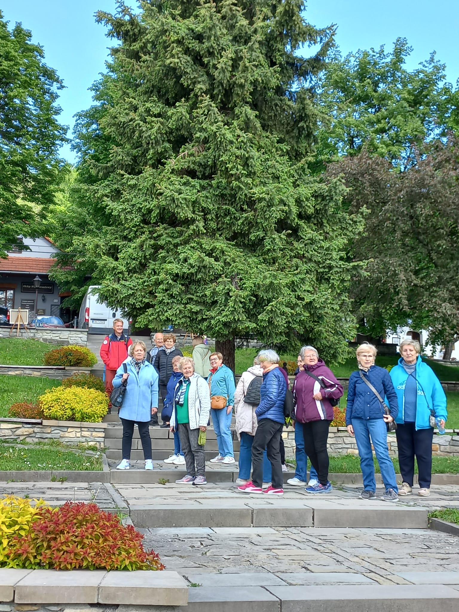Na ten dzień z „zamówioną pogodą”, członkowie grup turystycznych Trampy i Łaziki zaplanowali wycieczkę do Muszyny i zaprosili do udziału słuchaczy UTW spoza grup. Muszyna położona w powiecie małopolskim niespełna 2 godz od Tarnowa, posiada status miejscowości uzdrowiskowej z licznymi odwiertami i rozlewniami wód mineralnych. Znajdują się tu pijalnie wody mineralnej, sanatoria uzdrowiskowe, baseny, parki. Ja prywatnie, jestem zakochana w tym miejscu od lat 70-tych XX wieku (przyjeżdżałam tu na wczasy z rodzicami), jednak tamta Muszyna to było małe urokliwe miasteczko nad potokami Muszynką, Szczawnikiem i Popradem. Obecnie Muszyna jest przepięknym miastem rozwijającym się i z roku na rok przyciągającym coraz więcej turystów i wczasowiczów.
