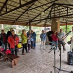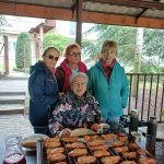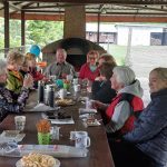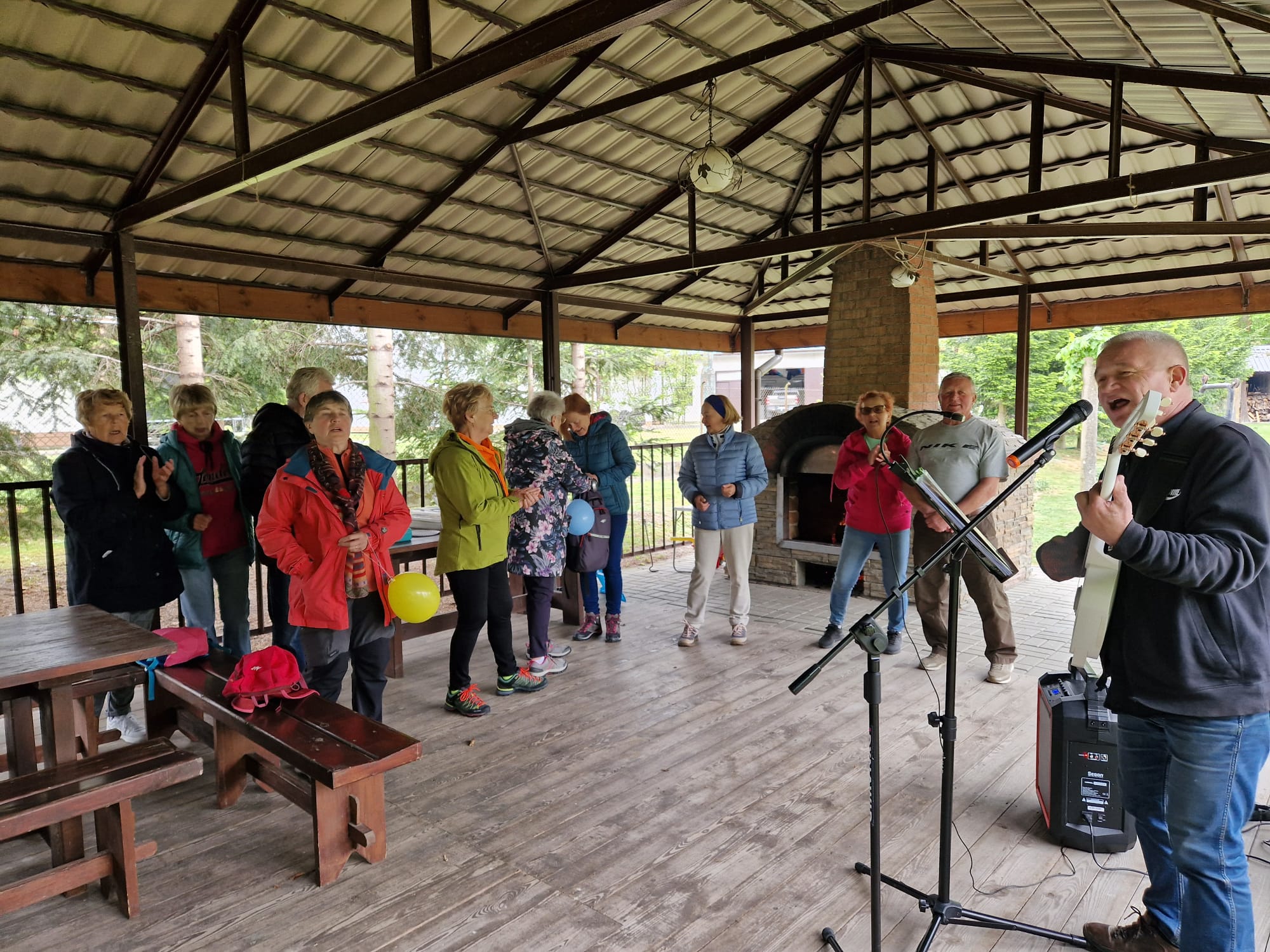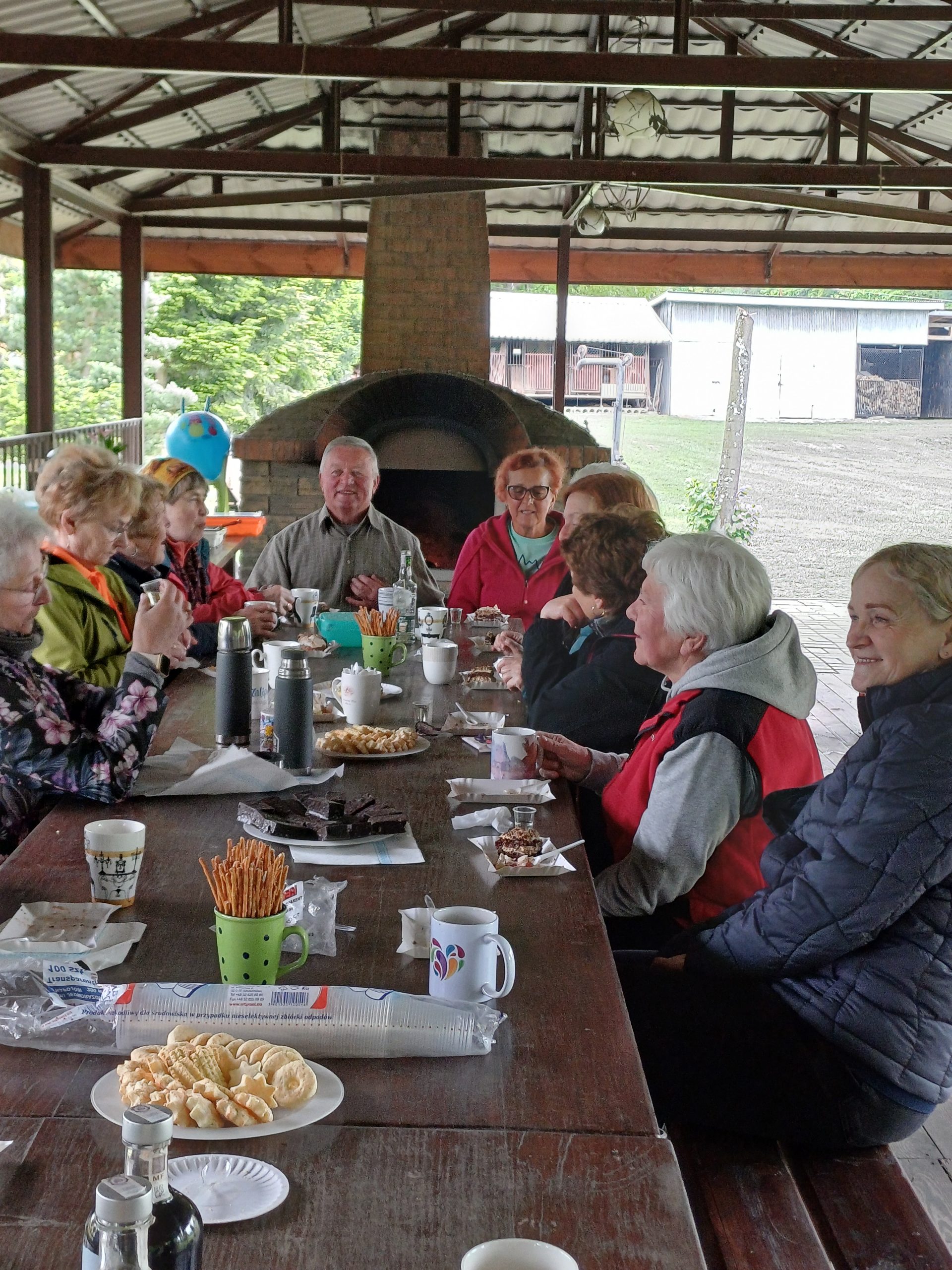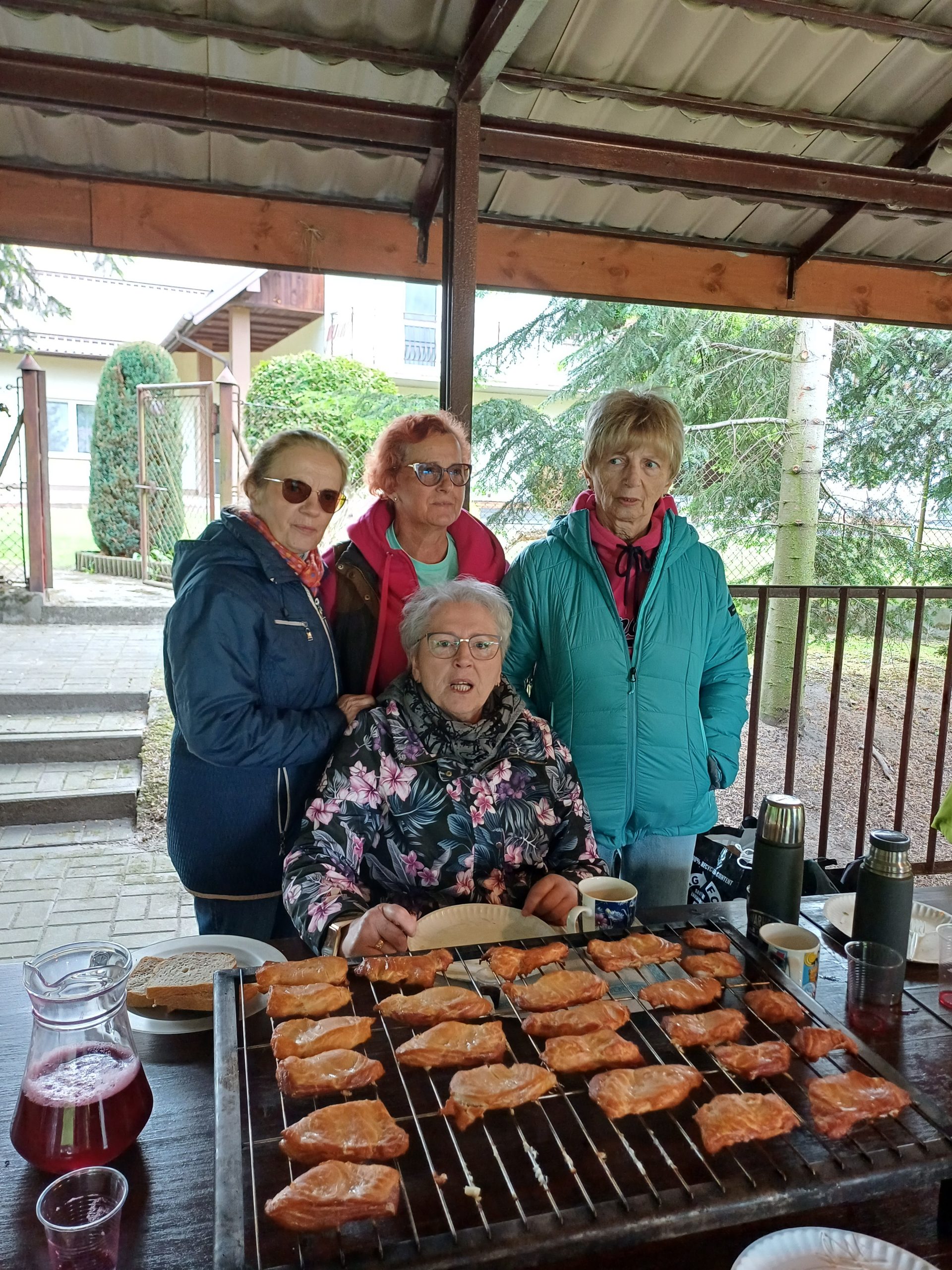 Dojeżdżamy do Dwudniaków i stamtąd spacerkiem dochodzimy na miejsce, mijając po drodze okoliczne stawy, wszędzie jeszcze pusto, bo trochę się ochłodziło i stąd brak wypoczywających nad wodą. Za to można zobaczyć wytrwałych wędkarzy. Najpierw są życzenia /zaległe imieniny /, toasty, a później Marysia serwuje nam pyszną zupę grzybową z borowików zebranych na własnej wyspie, zapach unosi się w powietrzu. Potem ciasta, kawa, herbata i rozmowy przy stołach pod wiatą, a Marek zapalił nawet w kominku, więc można było ogrzać się jego ciepłem. Jako że jesteśmy grupą turystyczną więc przyszedł czas na spacer ścieżką edukacyjną. Na polanie biwakowej widać naprawione już szkody wyrządzone przez dziki. Spacerując lasem delektujemy się jego pięknem, rozpoznajemy wiele roślin i drzew przy oszałamiającym śpiewie ptaków, niestety nie znamy i nie rozróżniamy treli poszczególnych gatunków. Dochodzimy nad stawy i zauważamy niepokojąco niski stan wody, susza, za to ptactwo wodne kryjące się w zaroślach daje o sobie znać. Wracamy do gospodarstwa, a tu czekają na nas kolejne smakołyki. W czasie naszego spaceru Marek usmażył wcześniej zamarynowanego amura i uwędził suma, oczywiście ryby z własnego stawu. Ryby smakowały wybornie, delikatne i bez ości, a do tego konsumowane na powietrzu, czysta bajka. Tak dobrych ryb to nawet nad morzem nie ma. Dołączyły również do nas dzieci i wnuki gospodarzy i wspólnie biesiadowaliśmy.