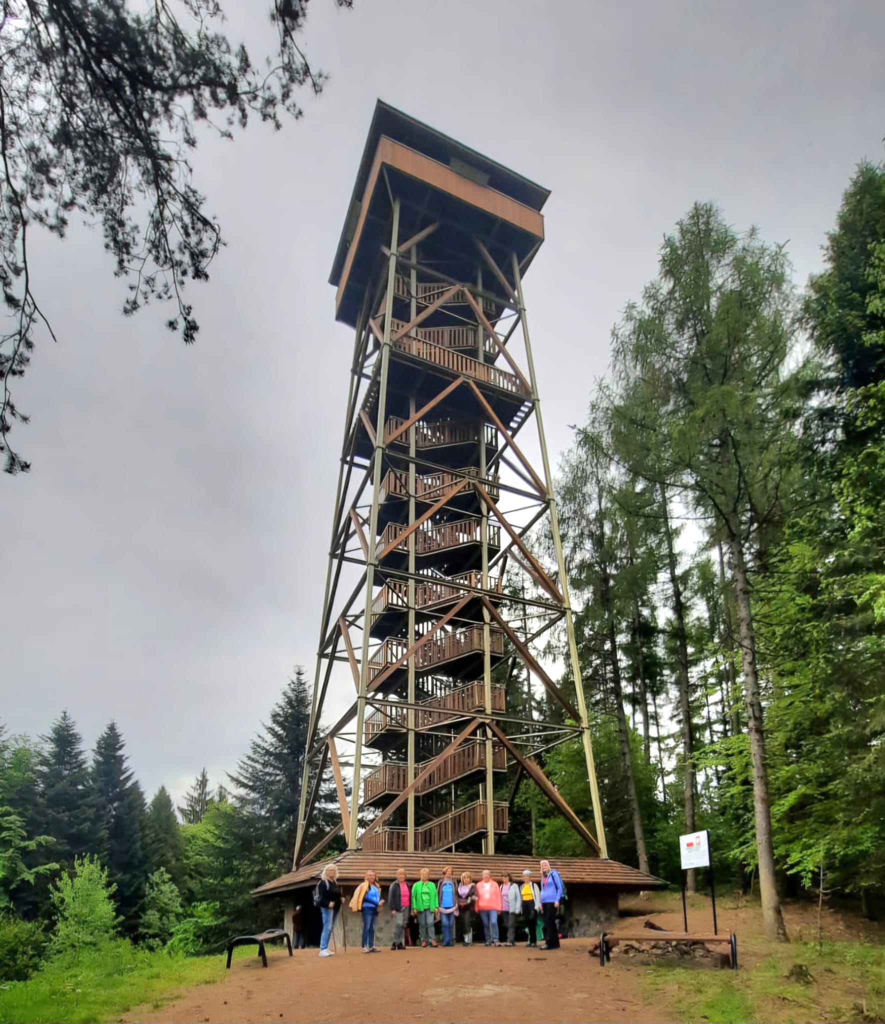 Próbujemy szukać nowych tras i miejsc, gdzie jeszcze nie byliśmy. Trudne to zadanie, ale częściowo to nam się udaje. I takim miejscem była ostatnio odkryta nowa wieża widokowa na Wiatrówkach koło Moszczenicy. Mierzy aż 24 metry i znajduje się na wysokości 430 m n.p.m., co pozwala na podziwianie rozpościerających się z niej widoków na Beskid Niski i Sądecki, Gorce, Pasmo Maślanej Góry, Pasmo Jaworzyny Krynickiej i Radziejowej, a także Tatry. Wieża została oddana do użytku w grudniu 2023 roku i nie ma jeszcze wokół niej żadnych ławek, gdzie można by było odpocząć. W Moszczenicy na cmentarzu zobaczyliśmy tylko z zewnątrz Kaplicę Chrystusa w Ciemnicy pochodzącą z 1680 roku. Wybudowana na rzucie sześciokąta w stylu barokowym, o ścianach i i dachu pokrytych gontem zawiera wewnątrz wiele ciekawych zabytków. Następnie udaliśmy się w kierunku Turzy, skąd planowaliśmy dojść do Obserwatorium Astronomicznego Królowej Jadwigi. Ponieważ trasa prowadziła cały czas drogą asfaltową, a było gorąco, to skorzystaliśmy z miejscowego busa i podjechaliśmy kilka przystanków dalej. Niestety dalsza część trasy w większości też była asfaltowa. Dopiero końcówka prowadziła drogą żwirową do położonego na wzgórzu w lesie obserwatorium. Byliśmy tu już kilkakrotnie i jesteśmy pełni podziwu dla dr Bogdana Wszołka, właściciela, pasjonata i pomysłodawcy tego obiektu. Na wzgórzu, pośród lasów, w oddaleniu od domostw okolicznych wsi, gdzie zanieczyszczenie nocnego nieba światłem sztucznym jest nikłe, panują idealne warunki do obserwacji gwiazd – jest to jedyne takie miejsce w Polsce. Żeby nie błądzić po lesie / brak oznaczeń / wracamy tą samą drogą do przystanku na pograniczu Turzy i Rzepiennika Biskupiego. W dzisiejszej wycieczce uczestniczyło 11 Łazików, a przemaszerowany dystans to 17 kilometrów.