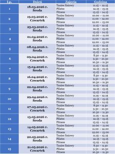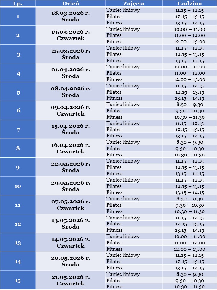 Od dnia 10 marca 2026 r. (wtorek) osoby zainteresowane mogą zapisać się na następujące zajęcia poprawiające sprawność fizyczną: Fitness, Pilates czy Taniec liniowy.