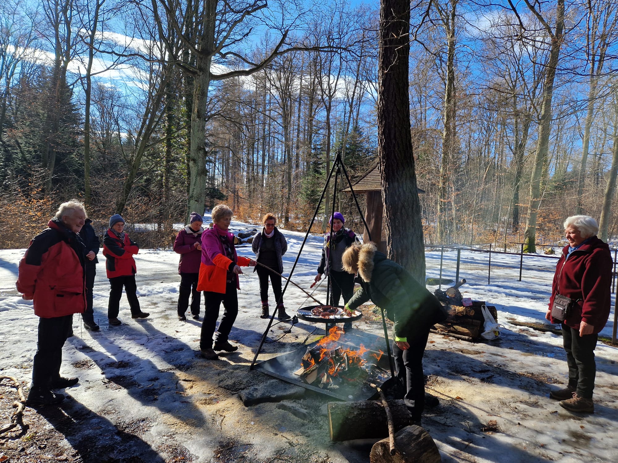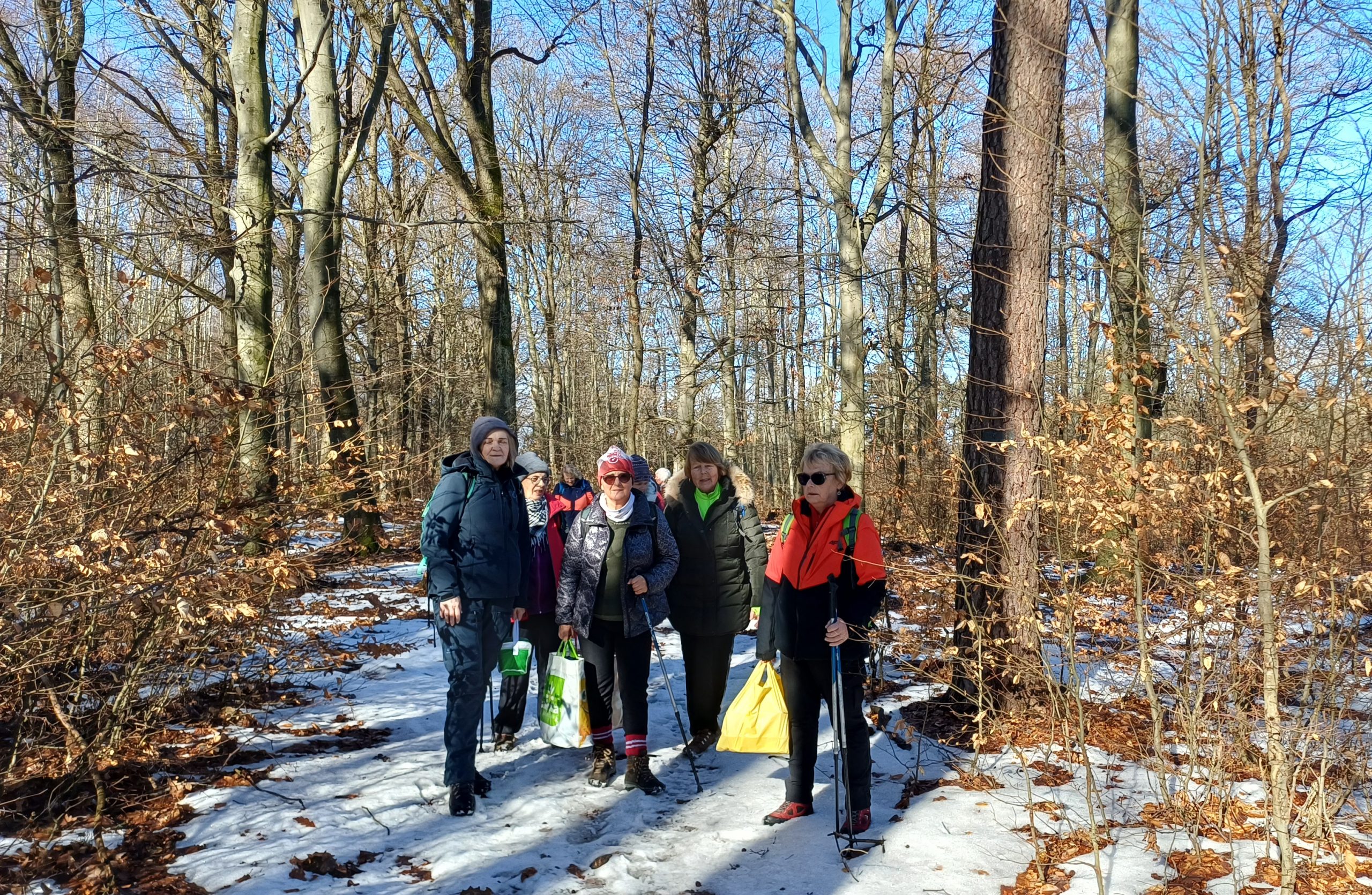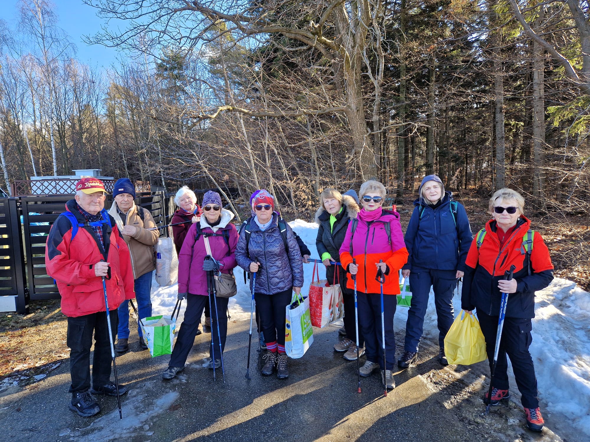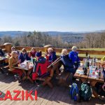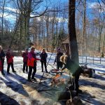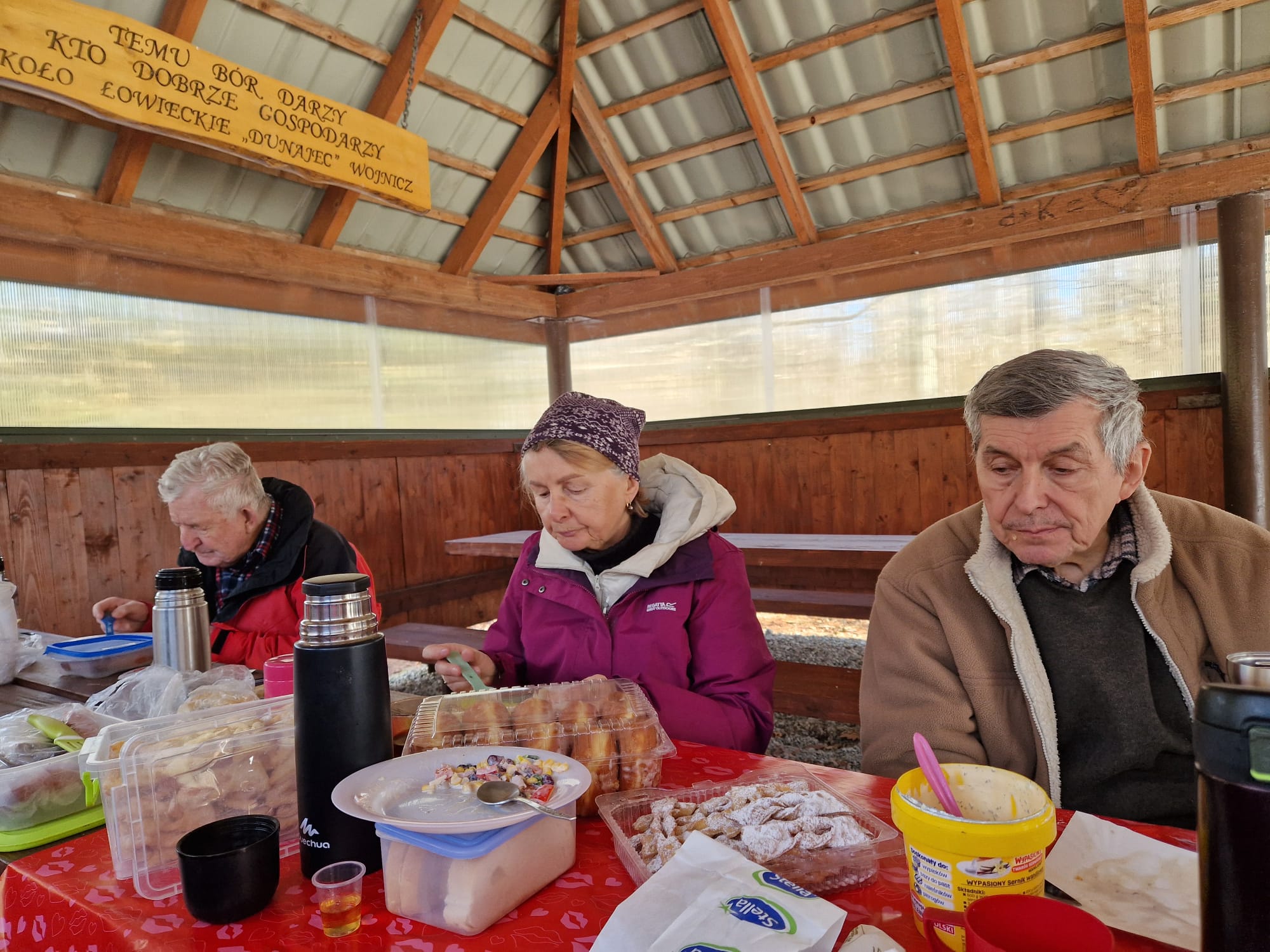 W tym roku karnawał kończymy spotkaniem na Wolicy, w wiacie Koła Łowieckiego „Dunajec”. Super miejscówka w lesie z osłoniętą od wiatru wiatą i z miejscem na ognisko. A kto niesie drewno do lasu – oczywiście Łaziki, suche i drobno pocięte szczapy pozwoliły na szybkie rozpalenie ogniska. A jak ognisko to i pieczone kiełbaski na ruszcie. Ponieważ wycieczka wypadła akurat w ” tłusty czwartek ” to były pączki i domowe chrusty, ciasta. Atmosfera biesiady była wspaniała, rozmowom nie było końca, a w dodatku pogoda też nam sprzyjała. Było bardzo ciepło /temperatura powyżej 10 stopni /, słońce, w lesie wiosna, kwitną bazie na drzewach, prawie nie ma śniegu, tylko leśne drogi oblodzone, więc szliśmy bardzo ostrożnie. Po drodze mieliśmy okazję podziwiać dobrze widoczne Tatry i inne mniejsze górki pogórza. Grupą 12 – tu osób schodzimy tym razem pod kościółek w Olszynach, skąd już blisko na przystanek. Dzisiejsza trasa miała 11 kilometrów, czekamy na wiosnę i na dłuższe, dalsze trasy. Tekst Urszula Marzec