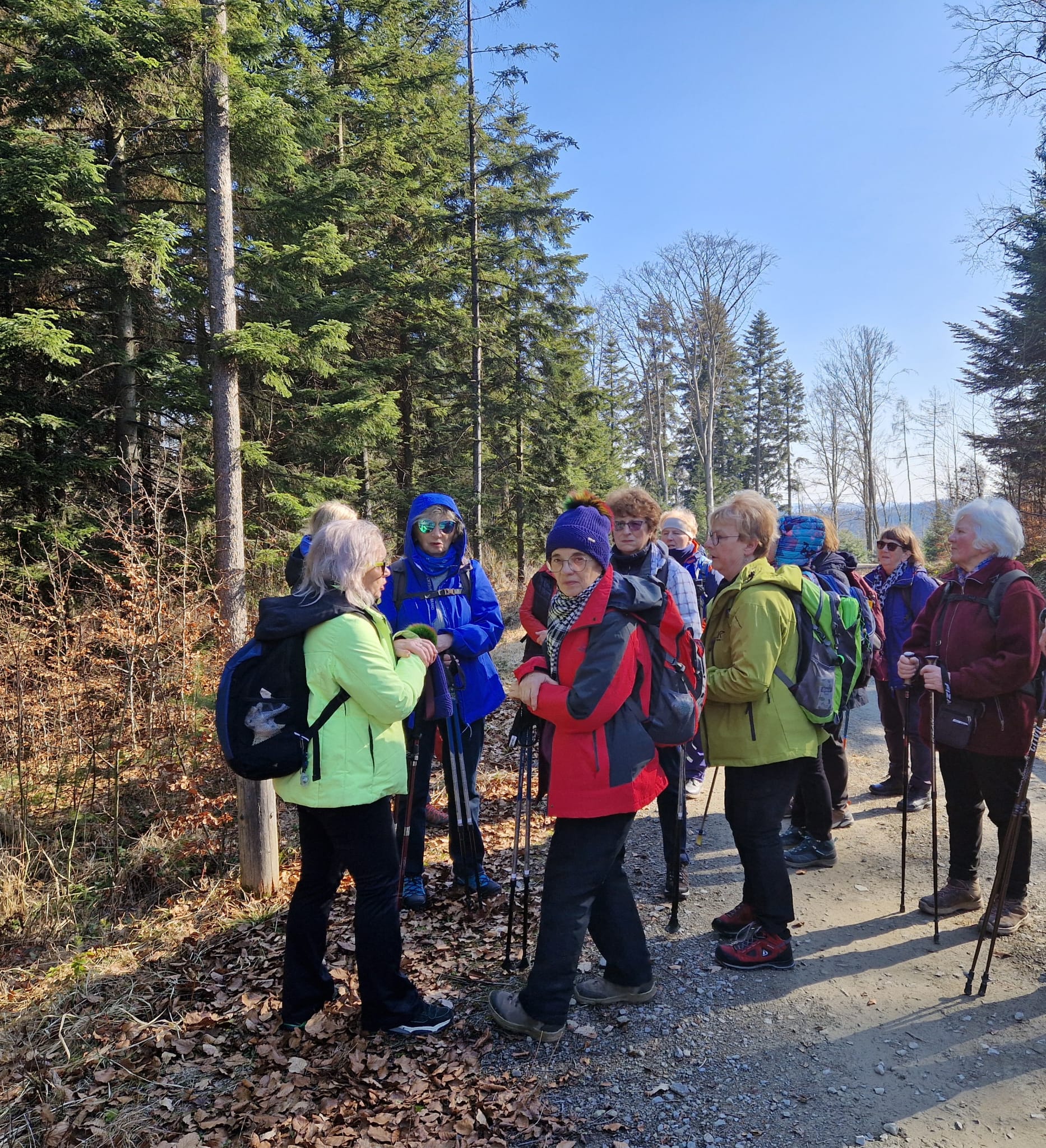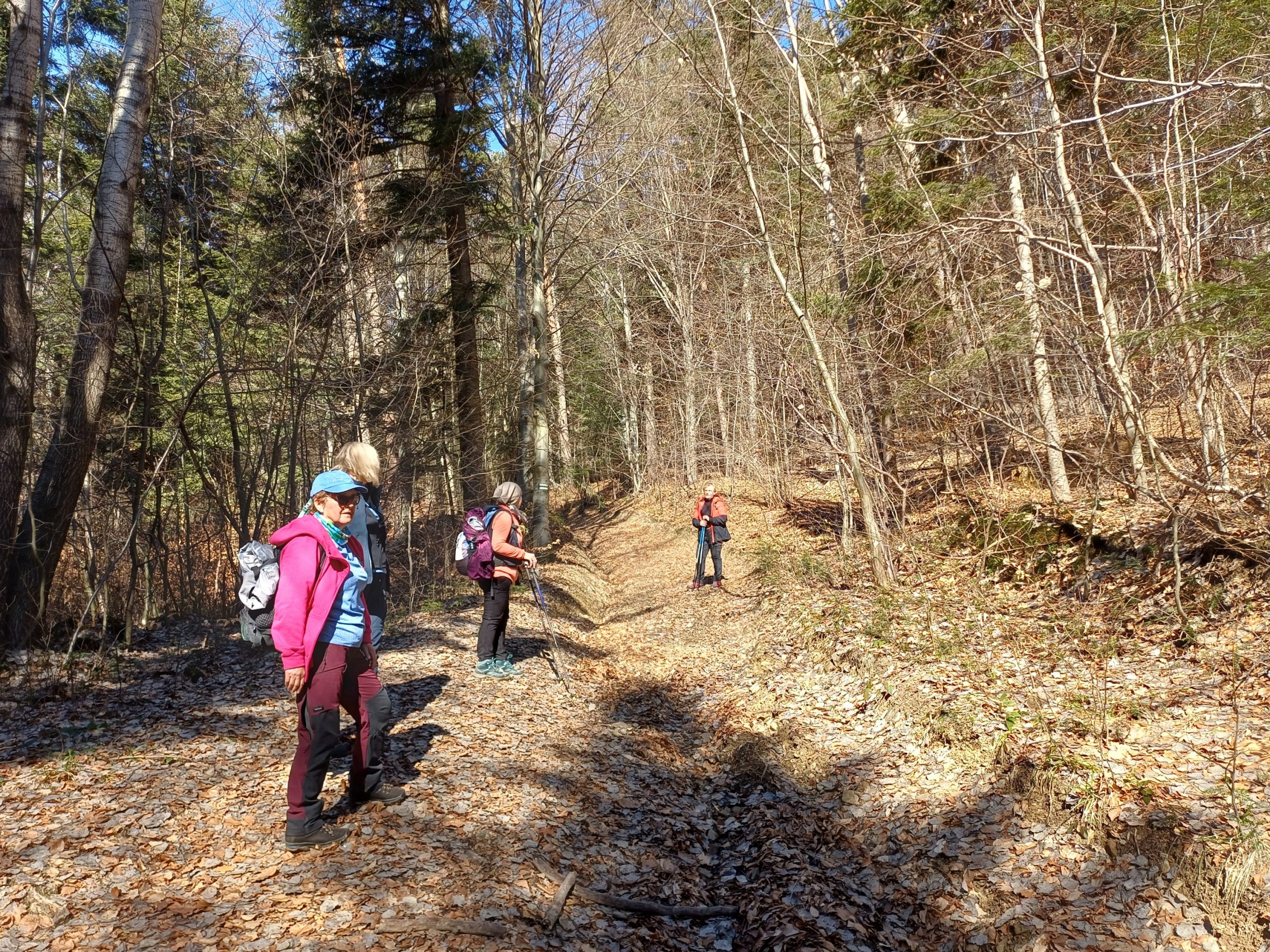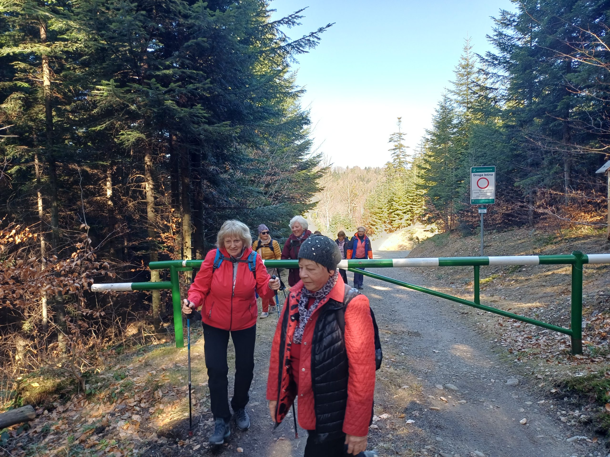 Mimo wczesnej godziny, na zbiórkę stawiło się 15-cie osób. Jastrzębia przywitała nas lekkim mrozem, oszronione trawy, a od strony północnej miejscami można było spotkać resztki śniegu. Po drodze spotkaliśmy lisa wracającego z nocnych łowów w kierunku lasu. Temperatura szybko podnosiła się, co przy pięknym słońcu było zaraz odczuwalne. Na Jamnej skierowaliśmy się do Schroniska Dobrych Myśli, gdzie zasiedliśmy na tarasie na śniadanie. Wygrzewaliśmy się w ciepłych promieniach słonecznych, podziwialiśmy wspaniałe widoki, a kawa z ciastem smakowała wybornie. Wracamy do Jastrzębi inną drogą i po przejściu 16 kilometrów jesteśmy na przystanku autobusowym. Tekst Urszula Marzec