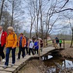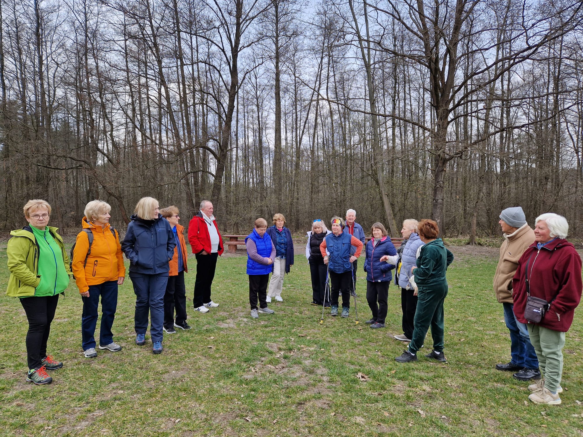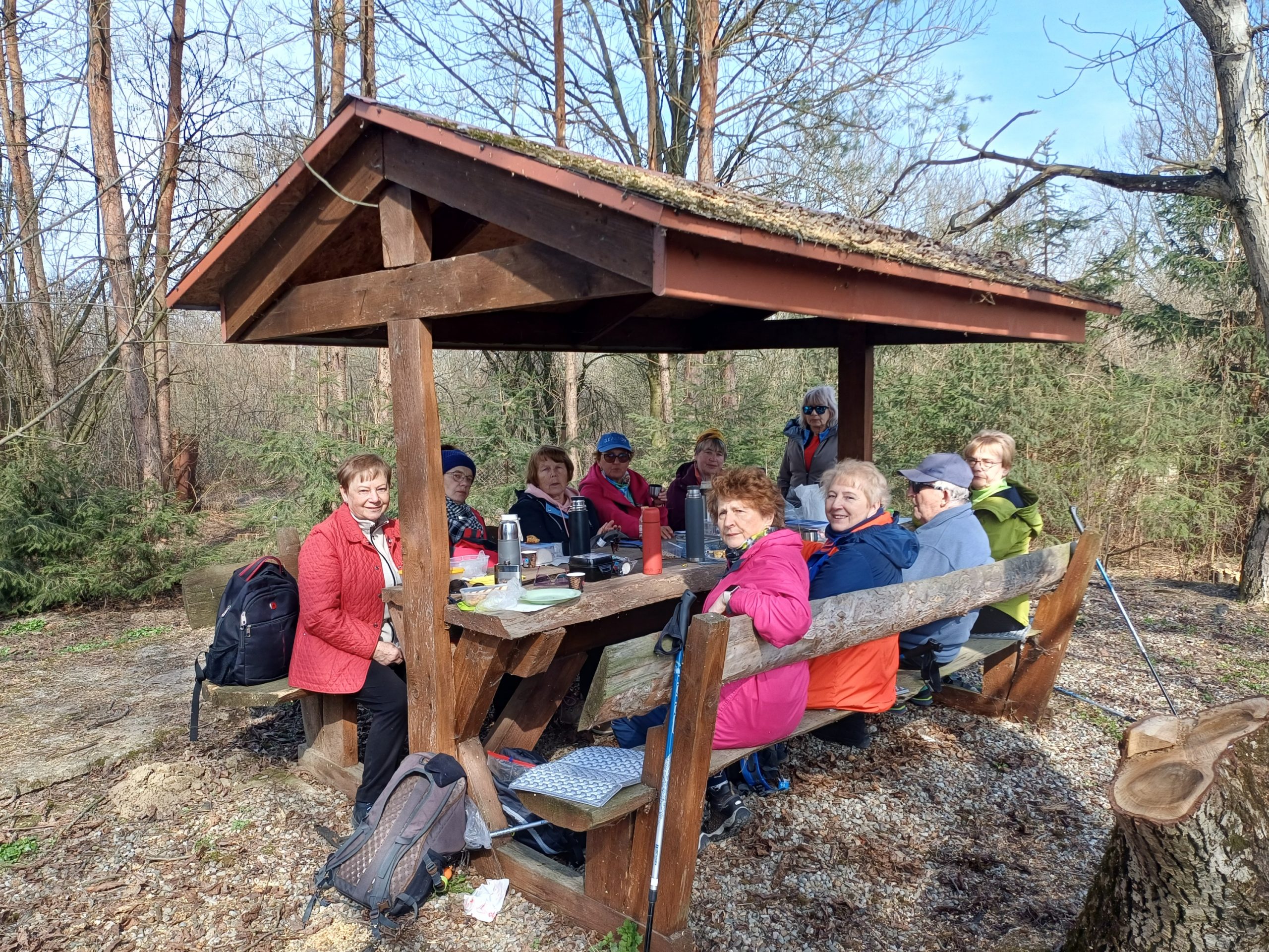 Po raz kolejny zostaliśmy zaproszeni przez Marysię Z. do ich gospodarstwa agroturystycznego w Wierzchosławicach, ale tym razem świętowaliśmy Jej 70-te urodziny. Były więc życzenia, toasty, tort, upominek od grupy, no i pyszności przygotowane przez gospodarzy. Po „części oficjalnej” i konsumpcji słodkości wybraliśmy się na krótki spacer ścieżką przyrodniczą przez Lasy Wierzchosławickie, jednocześnie szukając pierwszych symptomów nadchodzącej wiosny. Pogoda jak zwykle dopisała, było ciepło i słonecznie, a spacer umilały nam śpiewające ptaki. Stawy napełnione po brzegi wodą, a w oddali widać było pływające łabędzie, kaczki i inne ptactwo wodne. Powoli robi się zielono, kwitnie podbiał, zawilce, leszczyna, jednym słowem wiosna. A jak wiosna w przyrodzie to i nastrój weselszy, lżej na sercu, wszystkie trudności łatwiej znieść i większa ochota na dłuższe spacery. My spacerowaliśmy, a w tym czasie mąż Marysi smażył ryby z własnego stawu. Amur w wykonaniu Marka to coś wspaniałego, tak dobrą rybę to jemy tylko tutaj, nawet te nad morzem nie smakują tak dobrze jak te. Taka wspólna biesiada na łonie przyrody i jeszcze w tak pięknym miejscu, z pysznościami na stole to wspaniale spędzony czas, integrujący grupę, możliwość rozmów, dyskusji, wymiany poglądów. Oj, długo będziemy wspominać to spotkanie. Grupa stawiła się prawie w komplecie, było nas 18 – cie osób a spacerek miał dystans 9 kilometrów.